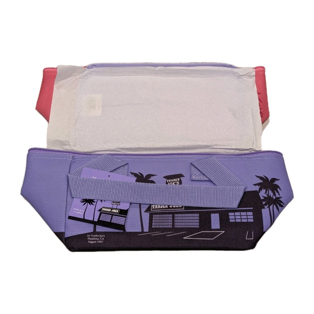 The Trader Joe's Valentines Day Mini Insulated Tote Bag is a set of two small polyester and nylon tote bags in either pink or lavender. They are 10 inches long, 6 inches high and wide, with a capacity of 1.5 gallons. These original bags feature a foldable design with a zipper closure, suitable for hand washing. Perfect for carrying items while keeping them insulated.