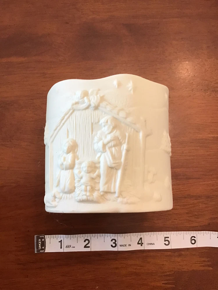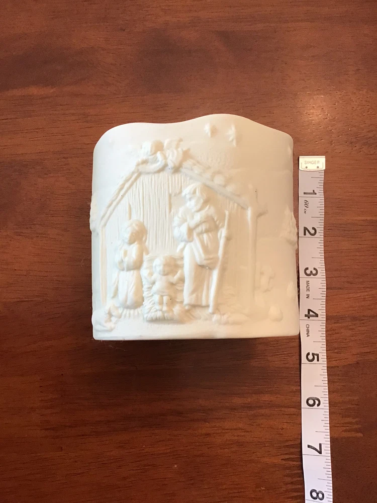 This White Porcelain Candle Holder features a Nativity Scene with a baby Jesus character. It has a solid, round shape and is of medium size, suitable for flameless/LED, votive, or mini candles. The ceramic material gives it a classic look, making it a decorative addition to your indoor space. The candle holder is designed in a Jar/Container style, perfect for creating a cozy and seasonal atmosphere in your home.