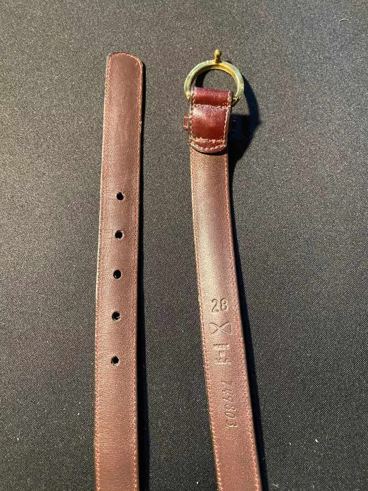 This Trafalgar belt is a vintage-inspired piece made of brown cowhide leather with a solid pattern. It features a brass buckle and is handmade with classic styling, making it suitable for both work and dress occasions. The belt is adjustable and comes in a size 32, perfect for men looking for a timeless accessory to add to their wardrobe.
