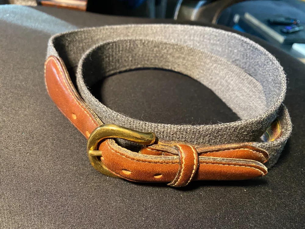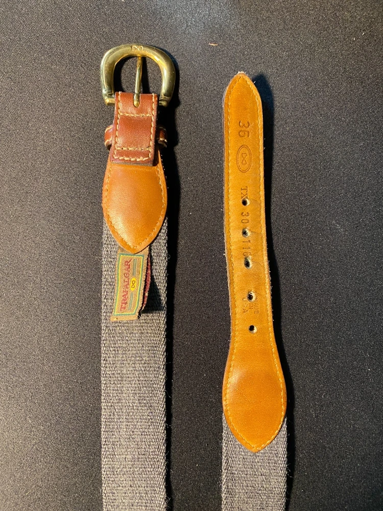 This Trafalgar belt is a vintage-inspired piece made of brown premium leather with a solid pattern. It features a brass buckle and is handmade with classic styling, making it suitable for both work and dress occasions. The belt is adjustable and comes in a size 33, perfect for men looking for a timeless accessory to add to their wardrobe.