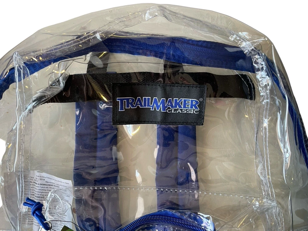 Occasion:TravelStyle:BackpackUPC:Does not applyColor:Clear With Blue TrimVintage:NoCountry/Region of Manufacture:ChinaBrand:TrailmakerFeatures:Adjustable Strap, Padded, Water ResistantFabric Type:PVCMaterial:PVCLining Material:PVCSize:Mediumgtin13:Does not applyTheme:SchoolClosure:ZipDepartment:MenPattern:Clear