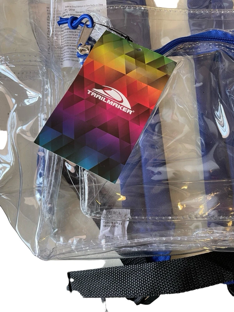 Trailmaker Back Pack Clear Plastic Clear Blue Trim For School, Work, Travel NWT