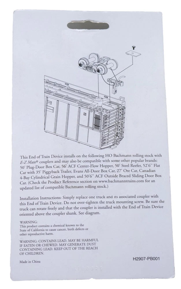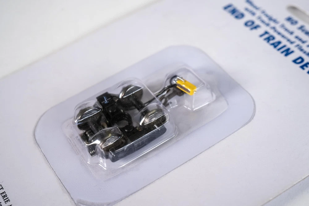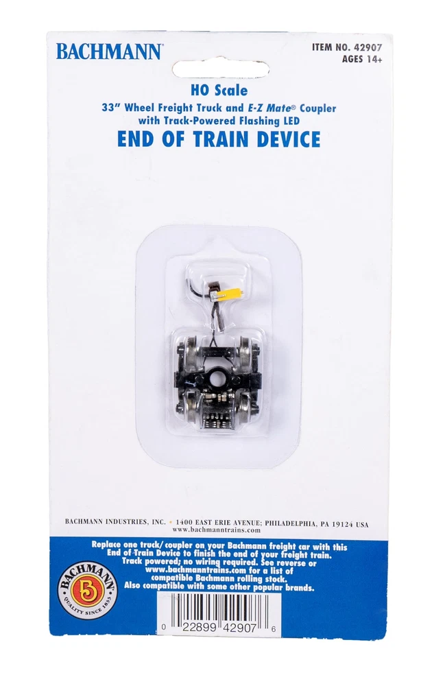 Trains End of Train Device with Track-Powered Flashing LED - HO Scale. End of Train Device with Track-Powered Flashing LED - HO Scale. Replace one truck/coupler on your freight car with this Flashing LED End of Train Device to finish the end of your freight train. Tracking powered; no wiring required. Operates on both DC and DCC layouts. It installs on the following HO rolling stock with E-Z Mate couplers and may also be compatible with some other popular brands: 50' Plug-Door Box Car, 56' ACF Center-Flow Hopper, 50' Steel Reefer, 52'6'' Flat Car with 35' Piggyback Trailer, Evans All-Door Box Car, 27' Ore Car, Canadian 4-Bay Cylindrical Grain Hopper, and 50'6'' ACF Outside Braced Sliding Door Box Car. (Check the Product Reference section on Trains for an updated list of compatible rolling stock.) Track-powered flashing red LED light Also known as a Flashing Rear End Device or FRED Operates on both DC and DCC layouts Features metal wheels, and E-Z Mate Mark II couplers HO Scale 1:87