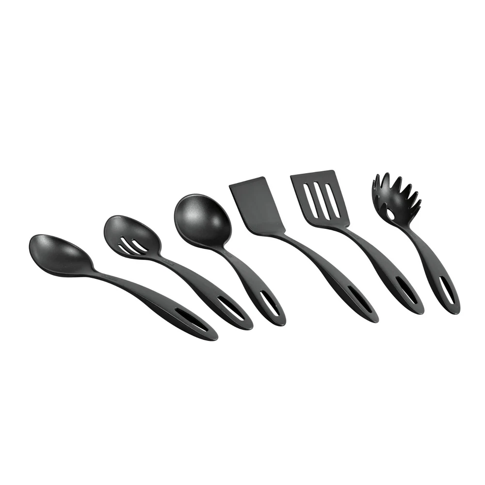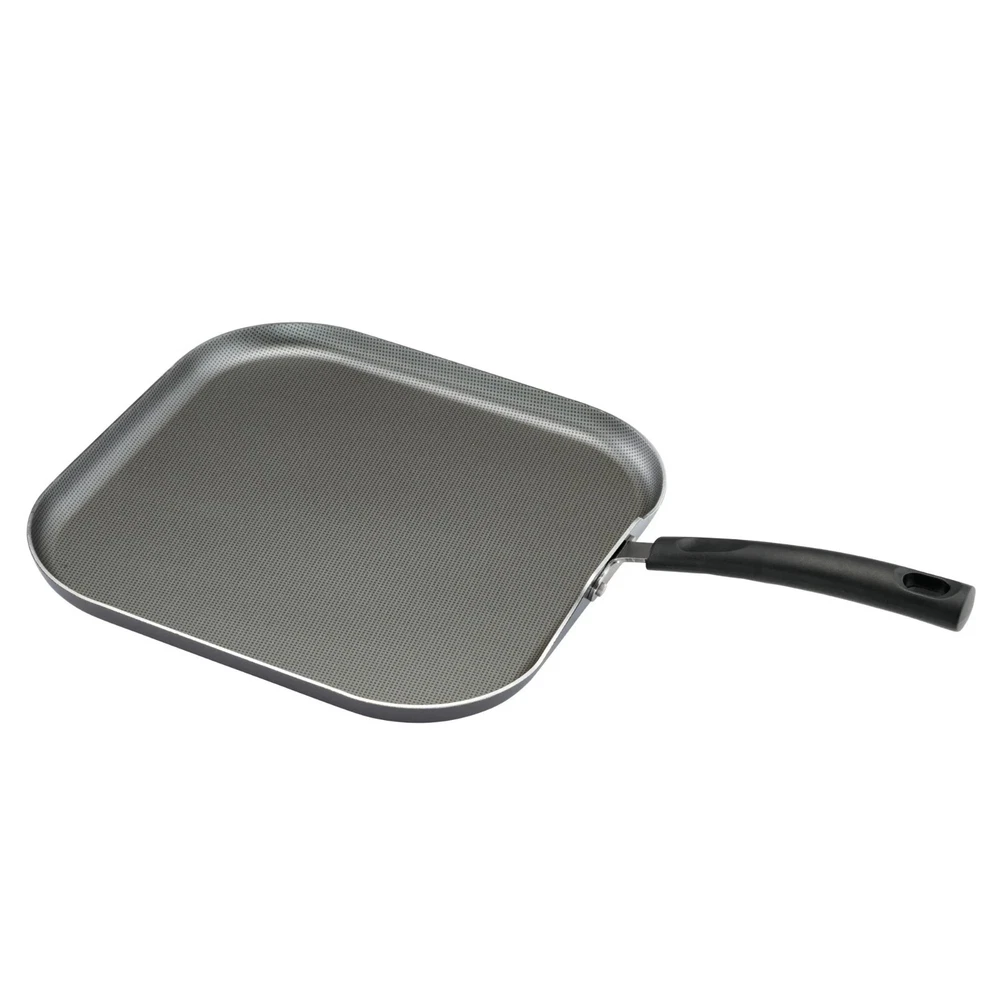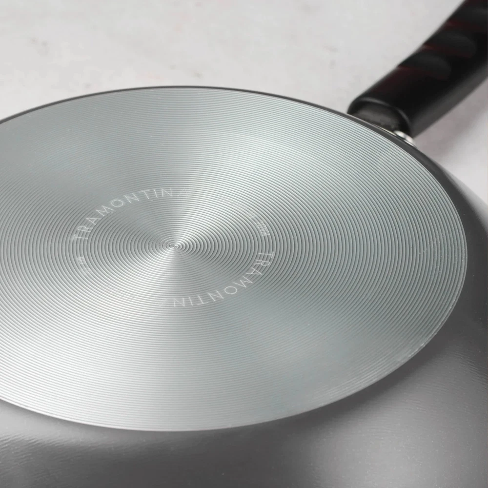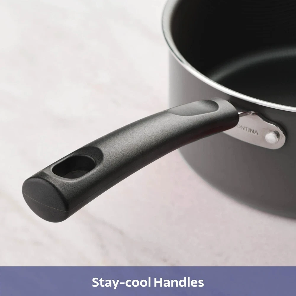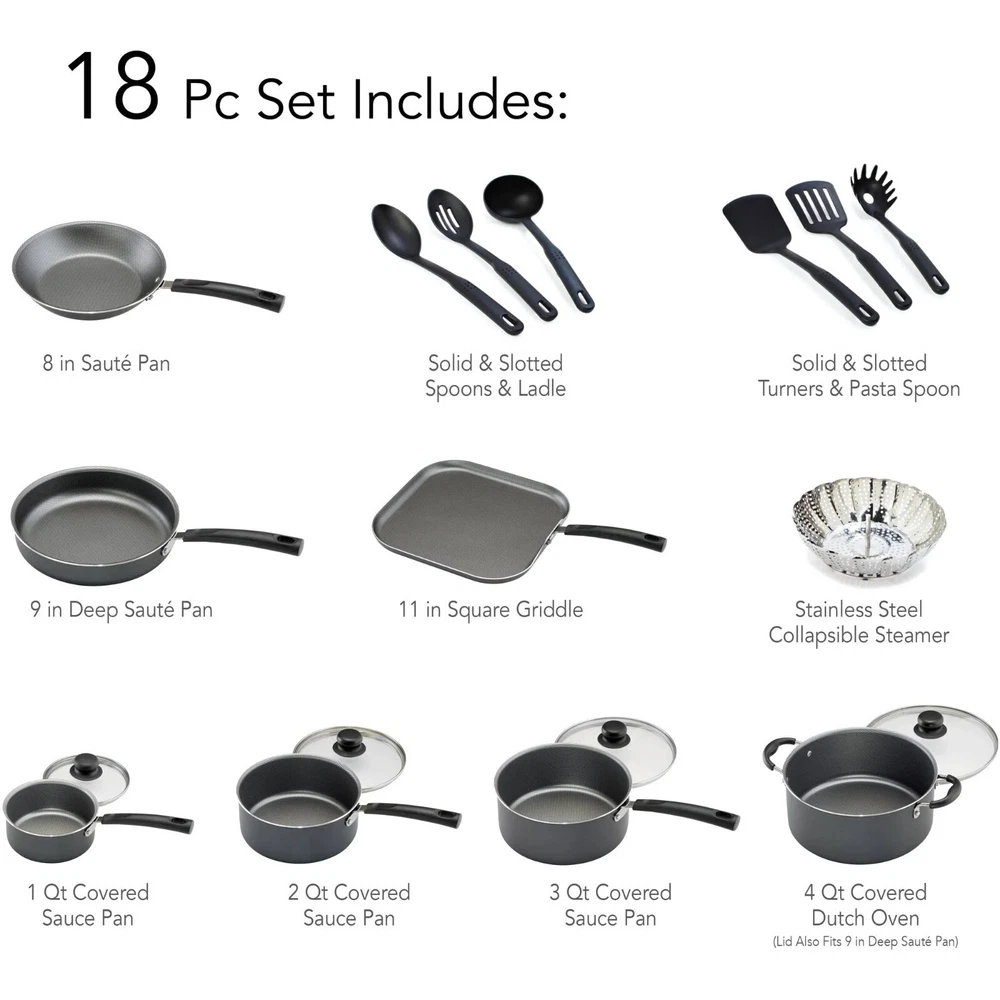 About this item Tramontina PrimaWare 18-Piece Nonstick Cookware Set: Patterned gray interior non-stick coating for easy cooking and cleaning Riveted, stay-cool handles Heat- and shatter-resistant tempered glass lids allow easy monitoring of cooking progress Dishwasher-safe Compatible with gas, electric and ceramic glass cooktops Set includes: 8" saute pan 9" deep saute pan 11" griddle 1 qt sauce pan with lid 2 qt sauce pan with lid 3 qt sauce pan with lid 4 qt Dutch oven with lid (4 qt lid fits the 9" deep saute pan) Stainless steel foldup steamer Solid spoon Slotted spoon Solid turner Slotted turner Pasta spoon Ladle
