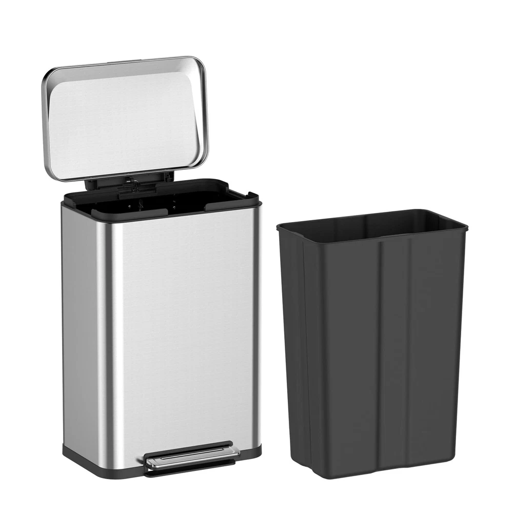 Trash Can Set 2 Pack, 13 Gal Stainless Steel Trash Can With Lid, Step On Waste Bins, 2 Gal Slim Trash Can for Narrow Space Trash Can Set - Our trash can combo value set solve both your kitchen and bathroom needs in one time, keeping your space tidy. The larger trash can 13 Gal is suitable for kitchen, living room and office, while the smaller trash can 2.1 Gal is suitable for narrow spaces thanks to its slim shape. Stainless Steel Trash Can - This trash can set is made of high quality stainless steel and thickened plastic inner buckets, sturdy and durable. All inner buckets are removable. Polished surface finish is fingerprint-proof and resists smudges, keeping trash can set shiny and easy to clean. Simple but Useful Design - This trash can has a rectangular shape so that it has spacious storage capacity than the circular can. Simple appearance matches perfectly with your modern home. Silent Close Lid - Our kitchen trash can use slow down technology, open and close will not make a lot of noise. Please rest assured that you can use it with no worry about disturbing your families break. Strong Steel Pedal - The steel pedal has experienced hundreds of test before sending to you, durable and strong. If you have any questions, please feel free to contact us.