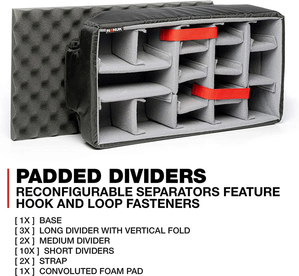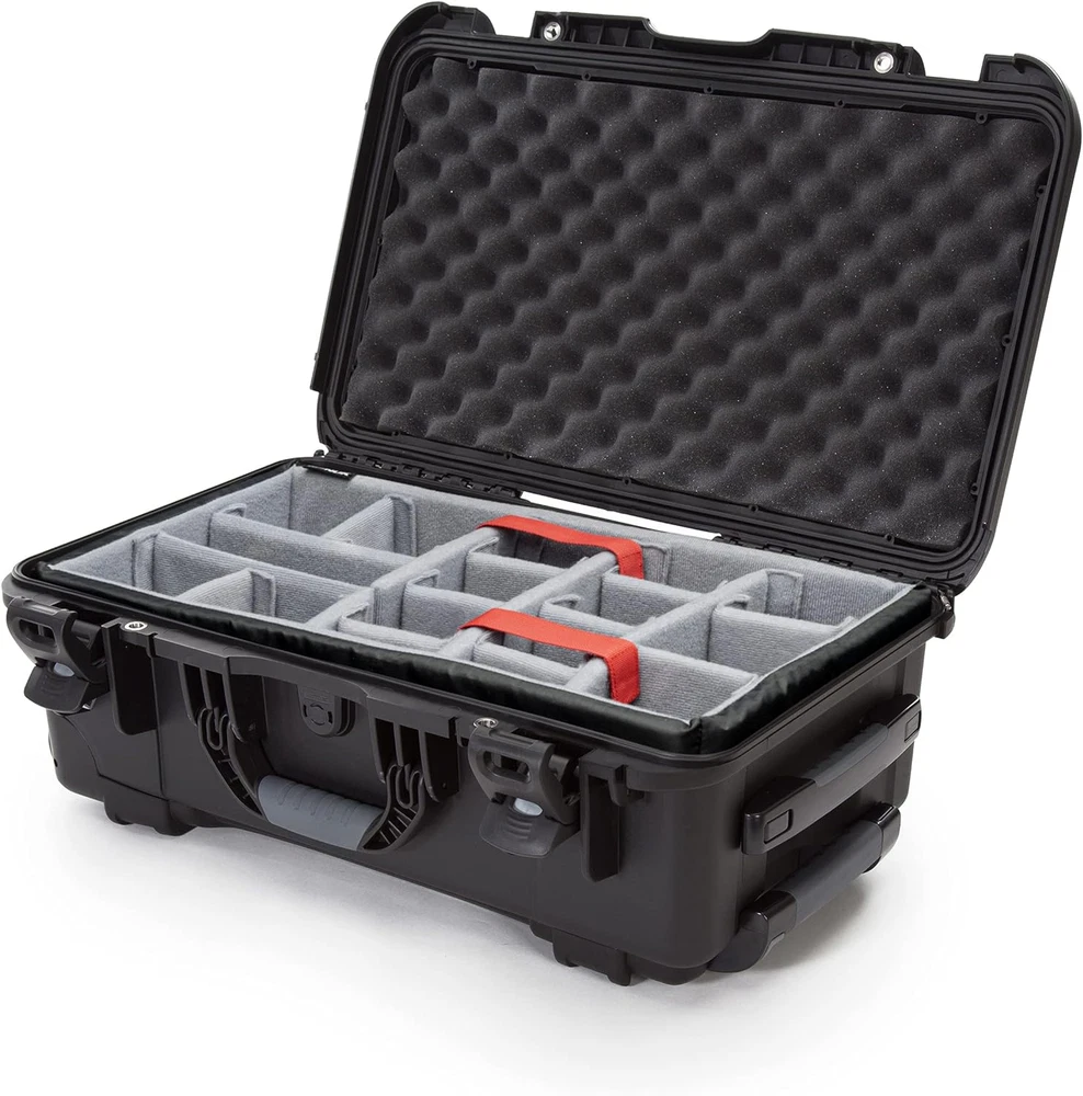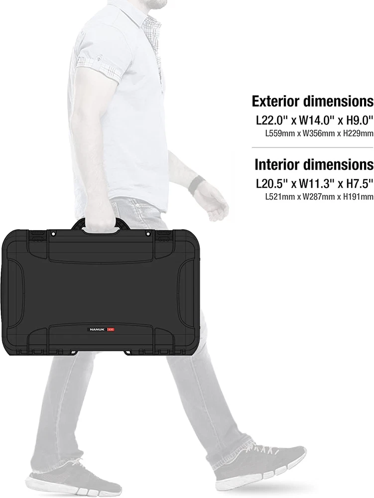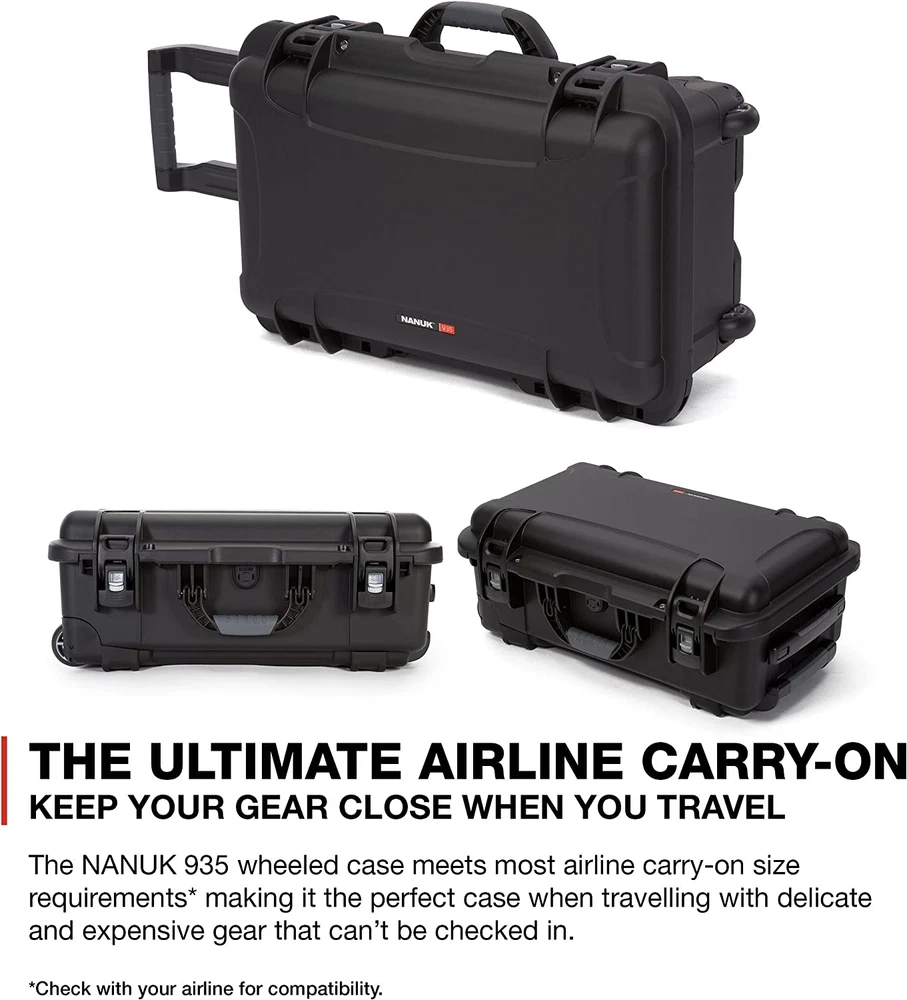 NANUK 935: Three soft-grip handles make this wheeled case one of the most convenient on the market, but that’s only the beginning. Polyurethane wheels withstand rough terrain while the one-handed retractable handle makes it easy to use and versatile. No matter where you’re headed, you’re guaranteed a smooth and hassle-free trip stainless steel hardware High performance gasket Automatic pressure release valve Molded-in bezel system Integrated lid stay Stackable Meets airline carry-on regulations Exterior Dimensions - 22.0" x 14.0" x 9.0" Interior Dimensions - 20.5" x 11.3" x 7.5"