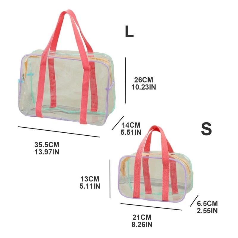 Features: With enough space to store your toilet articles. Also, it is versatile and can accommodate any items other than toiletries. Good transparent pvc material, softer and more pliable, durable and reusable. Top sturdy zipper closure with pulls keeps all your belongings dry. Transparent design allows you to easily see the content and location of stored items, quickly find what you are looking for without wasting for time. These portable toiletry bags are lightweight, suitable for traveling, business trip, student trip and more. The clear plastic travel bag can be used as travel bag, cosmetics bag, stadium bag, gym bag, swim bag, storage bag, waterproof bag, gift bag, jewelry bag, general packaging, daily necessities packaging bag, even stationery bag or schoolbag. Pvc material is waterproof and not easy to get dirty, very light, durable and reusable. Specifications: Material: PVC Large Size: Approx. 35.5x14x26cm/ 13.97x5.51x10.23in Small Size: Approx. 21x6.5x13cm/ 8.26x2.55x5.11in Type: Large, Small Package Includes: 1pc Transparent Cosmetics Handbag note: 1. Please allow 1-2cm errors due to manual measurement, make sure that you do not mind before you order. 2. Due to the difference between different monitors, the picture may not reflect the actual color of the item.