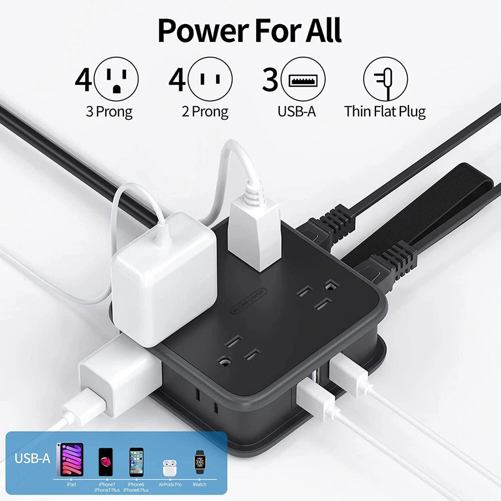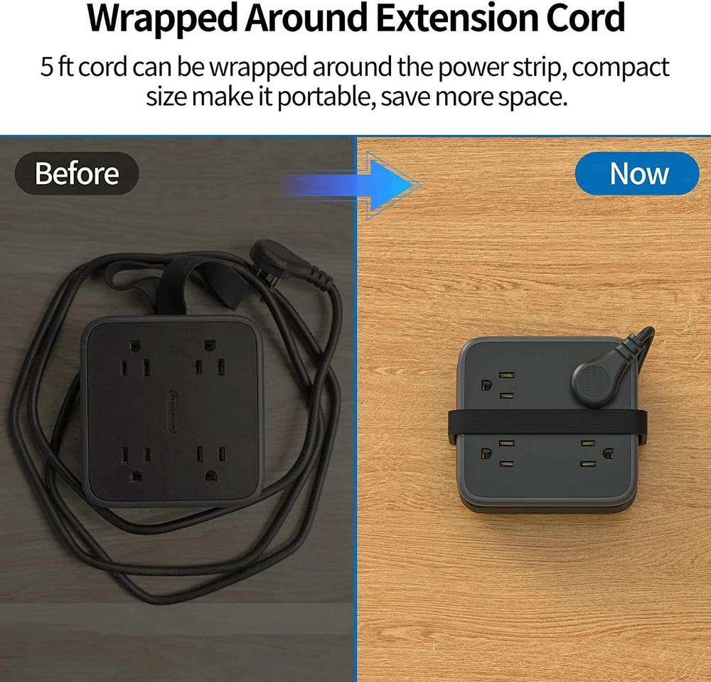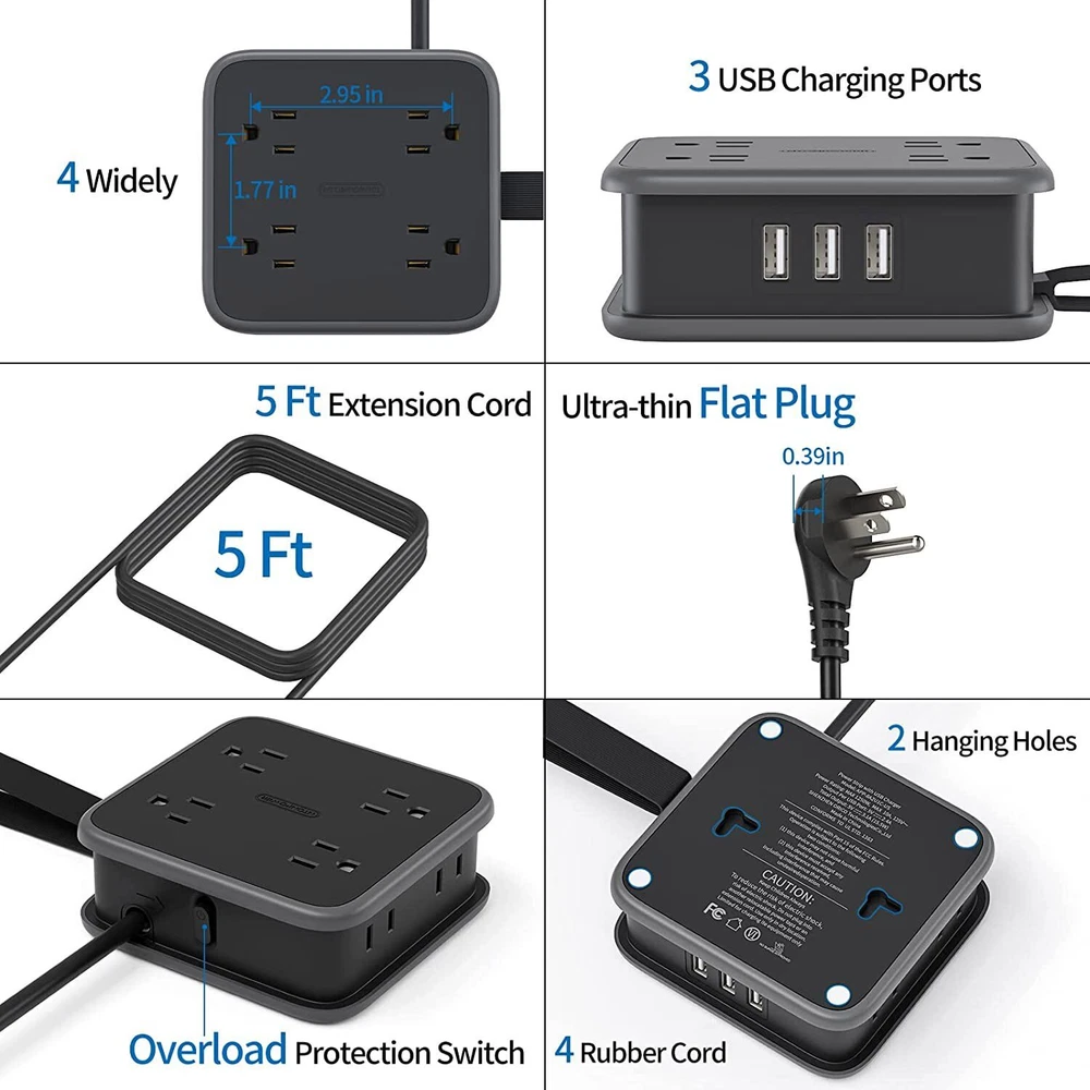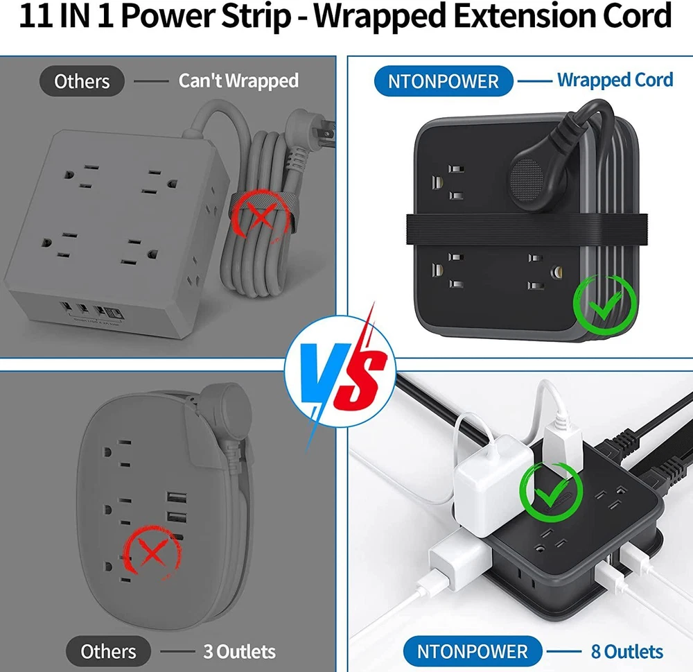 NTONPOWER 3 Side Outlet Extender - 8 Widely Outlets with 3 USB Ports Features: 【 Flat Plug Power Strip with 8 Outlets 3 USB Ports 】 The 3 Side outlet extender power strip 8 widely spaced AC outlets on 3 sides are separated enough to accommodate large plugs without blocking each other. The portable power strip features 3 USB ports totally provide 15.5W fast charging (5V 2.4A, 12W max).can power up to 11 devices simultaneously.Wide range voltage design, can be used on 120v to 240v circuit. 【 5 ft Wrapped Around Extension Cord 】 5 ft retractable extension cord with 45-degree right angled flat plug, it can easy wraps around the power strips’ body and plugs into a AC socket for neat storage.You will not get mad by the messy power cord, suitable for bedrooms, office.It is also very portable, and it is very suitable for traveling. 【 Compact Power Strip 】 The 3 side outlet extender extension cord size is (3.94*3.94*1.5Inch) .This desktop charging station is lightweight design to fit into backpack and suitcase .The widely spced AC outlets larger than standard socket - special design for big adapters.The compact design saves more space, suitable for the home nightstand, office, and college dorm room. 【 Wall Mountable & Right Angle Ultra Flat Plug 】 There are two mounting holes on back allows this power strip to be securely installed in various applications.The low-profile flat plug thickness is only 0.39inch, It is much thinner than traditional plugs, which can close to the wall easily, and hide in the back of furniture, bed or Nightstand, no waste for every inch space for your home. 【 Multi Safety Protection 】 This Flat Plug power strip has overload protection, short-circuit protection, over current protection, over-voltage protection and overheating protection. Overload protection ON/OFF switch will automatically cut power to protect connected devices when voltage surge is overwhelming.This portable extension cord without surge protector, so you can take it on the cruise and airplane without blocked by security inspection staff.