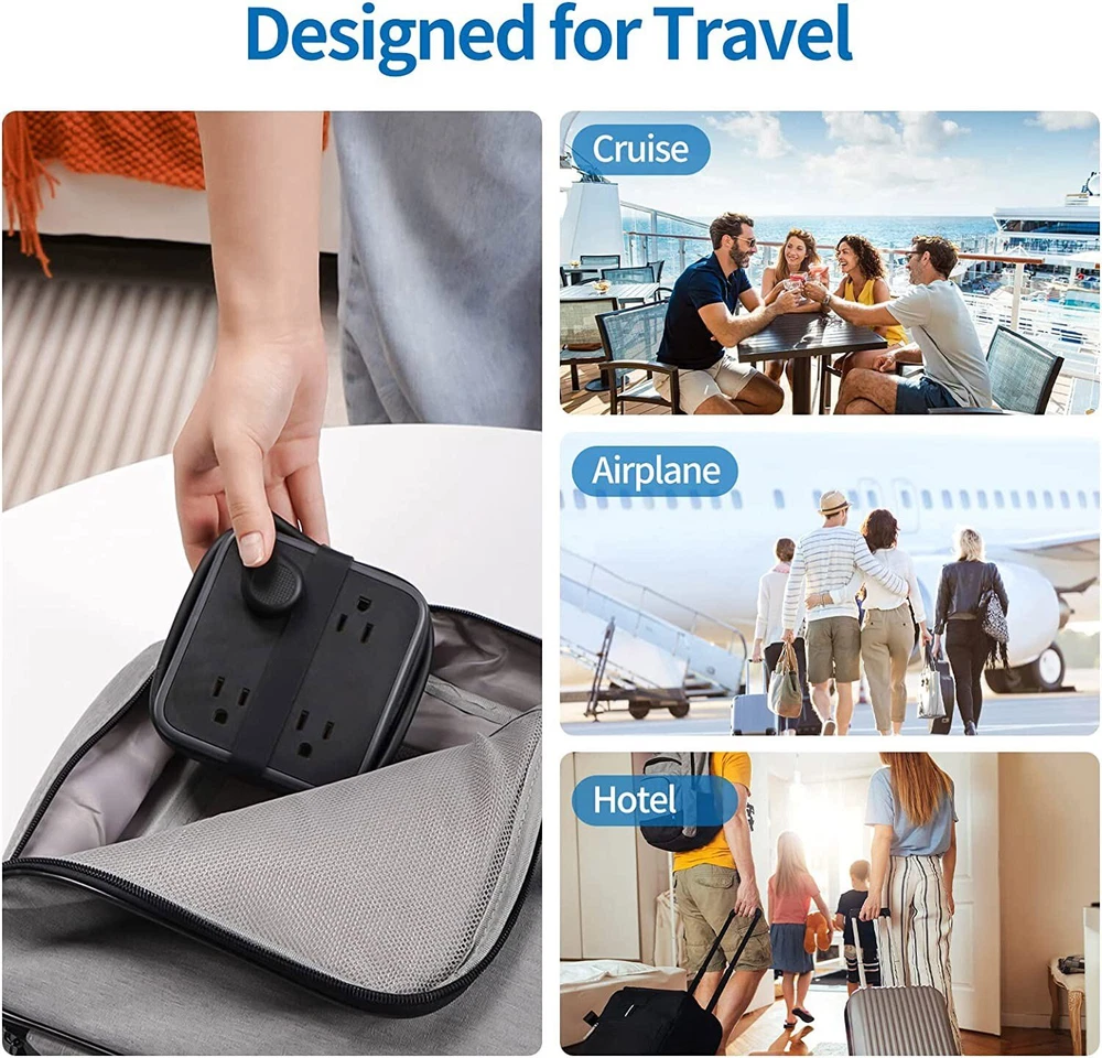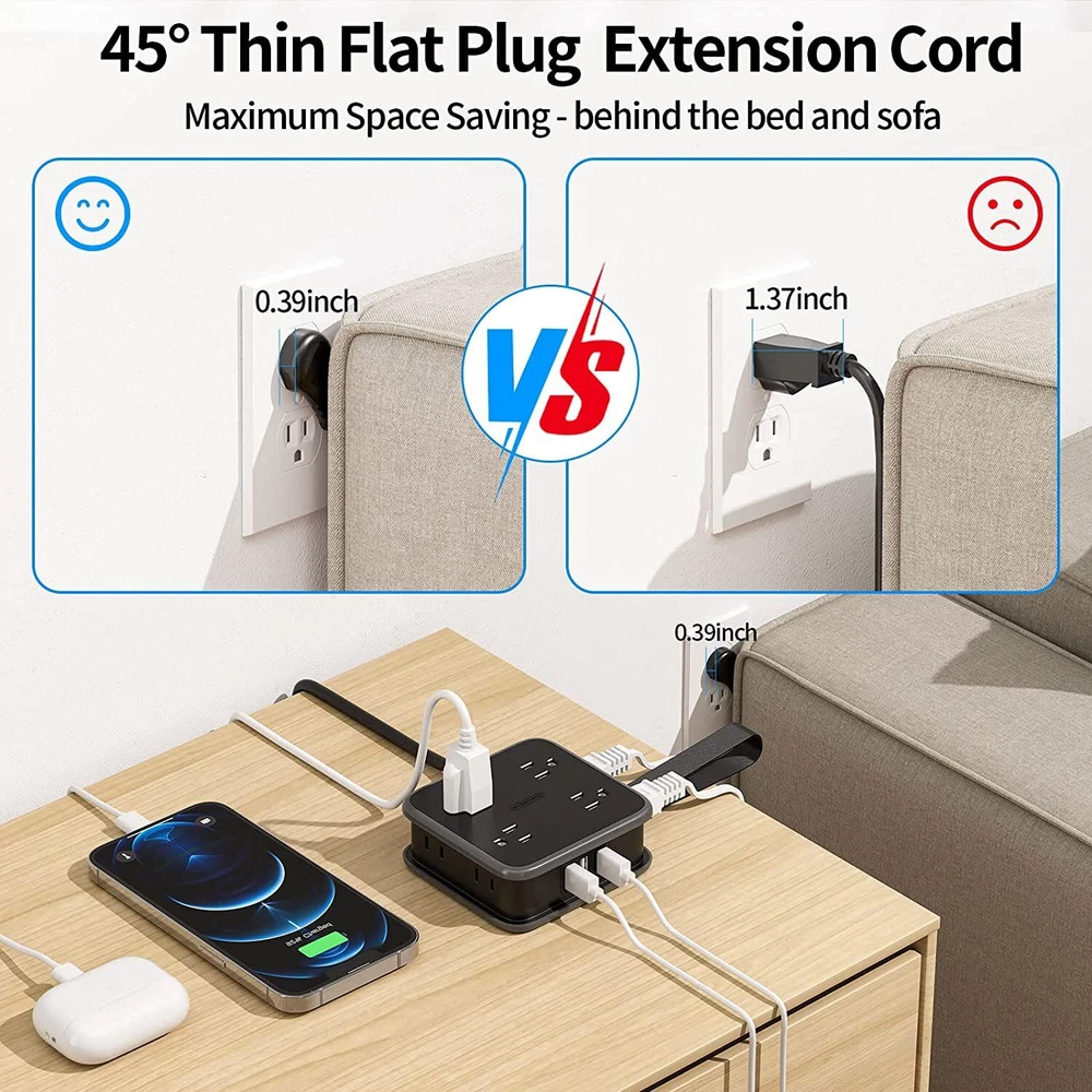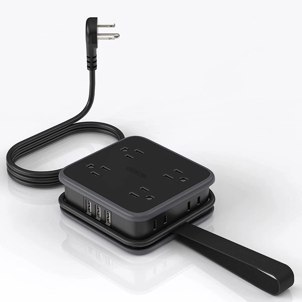 NTONPOWER 3 Side Outlet Extender - 8 Widely Outlets with 3 USB Ports Features: 【 Flat Plug Power Strip with 8 Outlets 3 USB Ports 】 The 3 Side outlet extender power strip 8 widely spaced AC outlets on 3 sides are separated enough to accommodate large plugs without blocking each other. The portable power strip features 3 USB ports totally provide 15.5W fast charging (5V 2.4A, 12W max).can power up to 11 devices simultaneously.Wide range voltage design, can be used on 120v to 240v circuit. 【 5 ft Wrapped Around Extension Cord 】 5 ft retractable extension cord with 45-degree right angled flat plug, it can easy wraps around the power strips’ body and plugs into a AC socket for neat storage.You will not get mad by the messy power cord, suitable for bedrooms, office.It is also very portable, and it is very suitable for traveling. 【 Compact Power Strip 】 The 3 side outlet extender extension cord size is (3.94*3.94*1.5Inch) .This desktop charging station is lightweight design to fit into backpack and suitcase .The widely spced AC outlets larger than standard socket - special design for big adapters.The compact design saves more space, suitable for the home nightstand, office, and college dorm room. 【 Wall Mountable & Right Angle Ultra Flat Plug 】 There are two mounting holes on back allows this power strip to be securely installed in various applications.The low-profile flat plug thickness is only 0.39inch, It is much thinner than traditional plugs, which can close to the wall easily, and hide in the back of furniture, bed or Nightstand, no waste for every inch space for your home. 【 Multi Safety Protection 】 This Flat Plug power strip has overload protection, short-circuit protection, over current protection, over-voltage protection and overheating protection. Overload protection ON/OFF switch will automatically cut power to protect connected devices when voltage surge is overwhelming.This portable extension cord without surge protector, so you can take it on the cruise and airplane without blocked by security inspection staff.