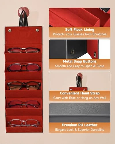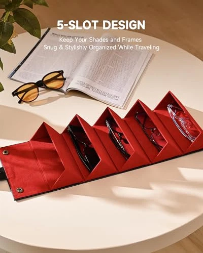 30 Days Return Policy Fast Delivery Trusted seller Travel Sunglasses Organizer, Foldable Travel Sunglass Case with 5 Slots for Multiple Pairs, Portable Eyeglasses Holder Glasses Storage Box for Women Men Home Display Travel, Black & Red Product Description 100% Leather Imported Travel sunglasses case organizer 5 slots, black andKeep Your Glasses Safe: Take your entire collection of glasses along on your trips with 's travel sunglasses organizer. Your shades and frames will remain scratch and damage proof thanks to the slot design and soft flock lining of this sunglass organizer. red Holds up to 5 Pairs: This roll-up glasses organizer features 5 slots to accommodate multiple pairs at once, allowing you to match different glasses to your outfit, mood, or occasion. Not just a sunglass organizer, it also conveniently holds your accessories on the go such as watches and jewelries. Travel Friendly: Our portable sunglasses case folds down compactly to a size of 6.6 x 5.1 x 4.9 inches and snaps shut securely, taking up less space than a pair of shoes and fitting into any suitcase with ease. Space Saving: With a hanging strap atop, this sunglasses holder hangs effortlessly on any hook behind a door, in a closet, or on the wall. It's perfect for keeping your glasses organized in one place or elegantly displayed at home. Perfect Gift: The high-quality PU leather exterior gives this practical travel sunglass case a chic and sophisticated look, making it an ideal gift choice for women and men who value both aesthetic appeal and practicality. Shipping Returns Payment Shipping Shipping is FREE to all addresses other than APO/PO boxes in the lower 48 states. All our stock ships from US-based warehouses. Shipped via USPS or UPS (depending on location and package weight) Unless stated otherwise, all orders will ship within 24-72 hours of your payment being processed. Check our feedback to see the great reviews of FAST shipping we offer. Returns As our valued customer, we will do our best to make sure the product you receive arrives to you on time and as expected. If you are not satisfied with your purchase, please contact us within 30 days of receiving your order to process a return. Payment We currently accept payment via eBay managed payments only. Once payment is cleared, we will dispatch your shipment within 1-3 business days. Please refer to the "Shipping" tab for more information regarding shipping speed to your destination.