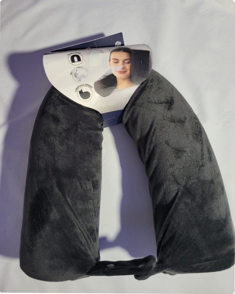 The traveling neck pillow in black is a comfortable and convenient accessory for travel. This specially designed pillow provides support for the neck during long journeys, helping to alleviate neck pain and stiffness. Its compact size makes it easy to bring along on planes, trains, or in the car, ensuring a comfortable travel experience. Made for ease of use and comfort, this neck pillow is a must-have for any traveler.