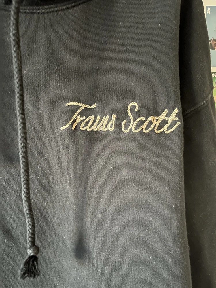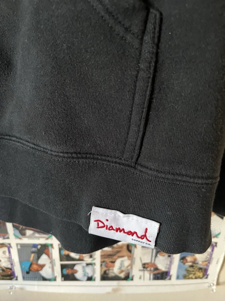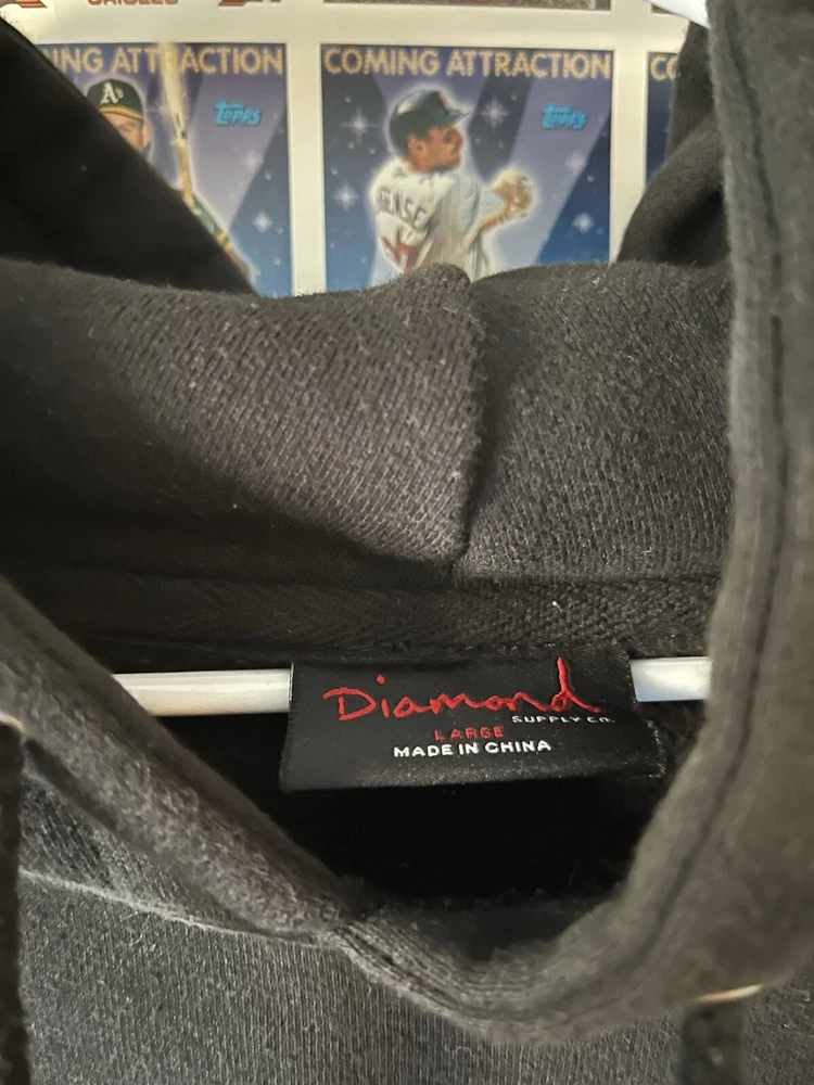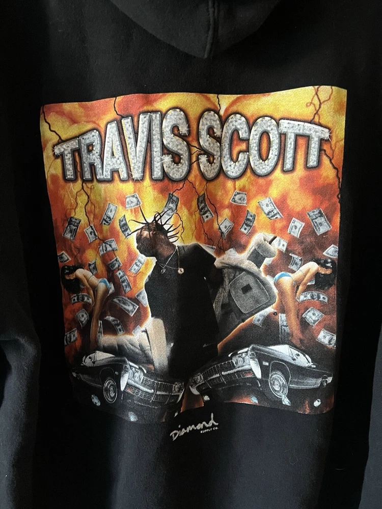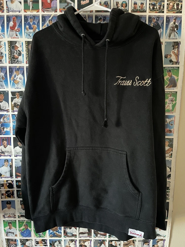 Introducing the Travis Scott x Diamond Supply Co. Merch Hoodie in black, perfect for any hip hop fan. This hoodie features a solid pattern with a logo accent and a drawstring closure. It is made of a cotton blend fleece material, making it heavyweight and suitable for all seasons. The long sleeve hoodie is machine washable and comes in a regular fit, suitable for men who wear a size large. It is a designer piece, part of the Travis Scott product line, perfect for those who love hypebeast and hip hop themes. The collarless hoodie is a great addition to any activewear collection.