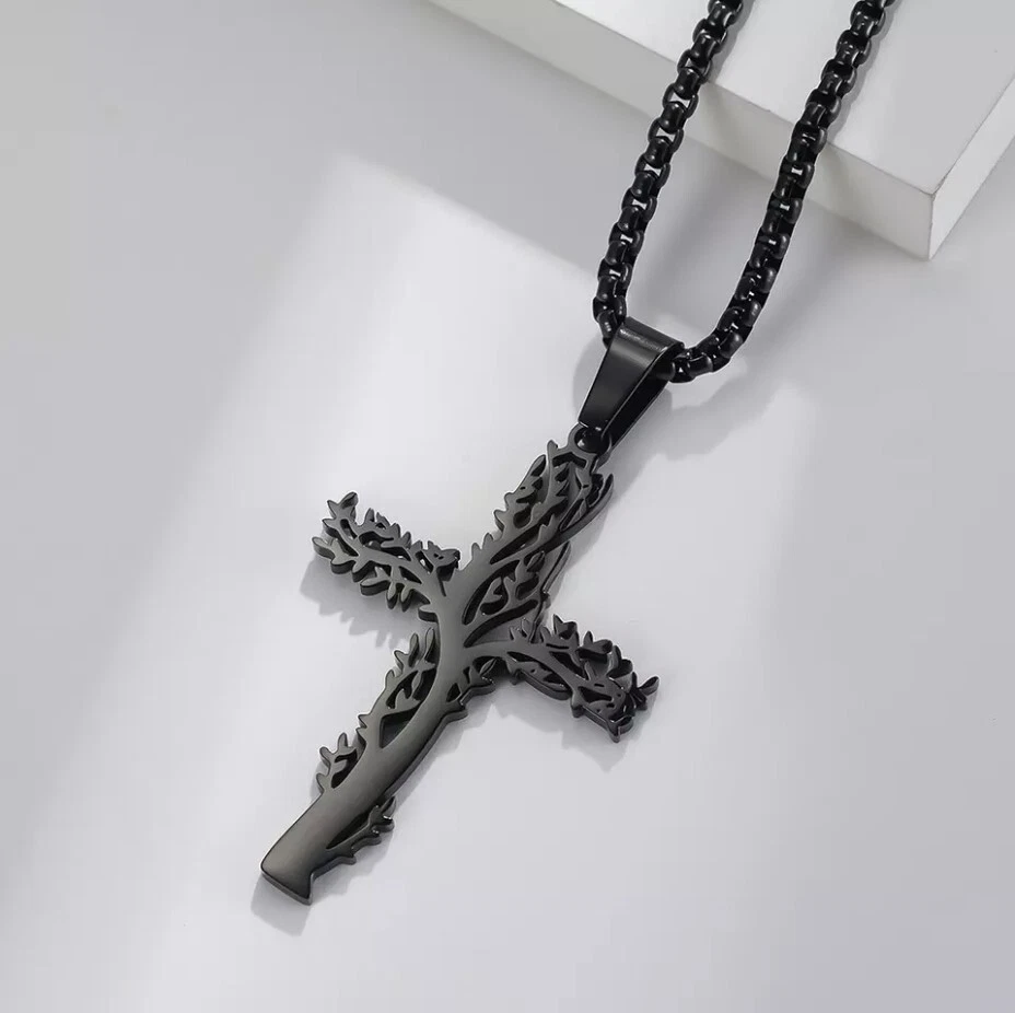 Tree of Life Cross Pendant Stainless Steel Black Necklace, Great Gift Too!