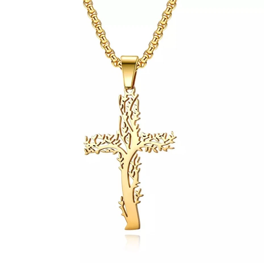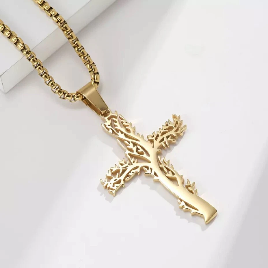 Tree of Life Cross Pendant Stainless Steel Gold Necklace, Great Gift Too!