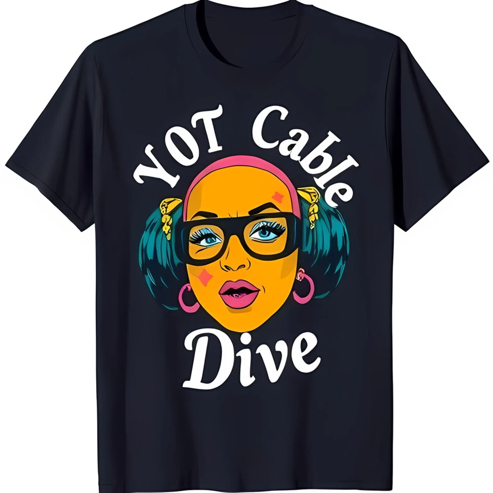 Trendy Black T-Shirt with Cartoon Woman Graphic & 'Not Cable Dive' Text