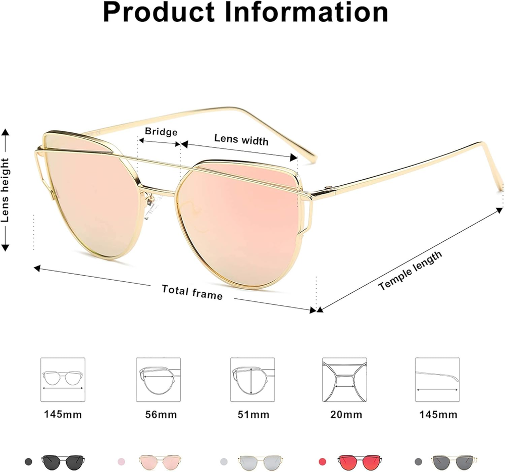 Love these stylish cat-eye sunglasses! The bright gold/pink mirrored lenses add a chic, retro vibe, and they feel lightweight yet durable. Perfect for elevating any outfit while providing great sun protection. Super comfortable for all-day wear—definitely a must-have accessory! Fast shipping too. Highly recommend!