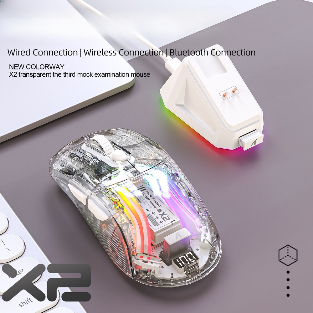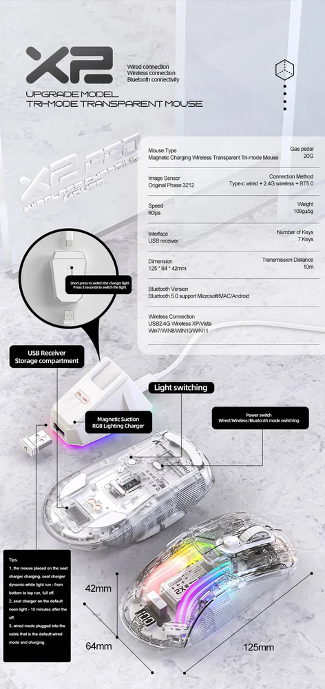 X2 Pro Magnetic Charging Bluetooth Mouse, Tri-Mode , RGB Lights, Transparent, Battery Indicator, Computer Phone X2PRO wireless mouse introduction: Product interface type:USB-Type-C Product connection method: USB, 2.4G, Bluetooth Product optical sensor: original phase 3212 Lighting effect: 11 kinds Frame rate (IPS):60IPS Maximum acceleration (G): 20G Refresh rate (FPS):4000FPS DPI:1200(Default)-1600-2000-2400-4000 Battery capacity:500mA polymer battery Charging current:280mA Charging voltage: 5V Product size:126.3*62.5*38.4mm