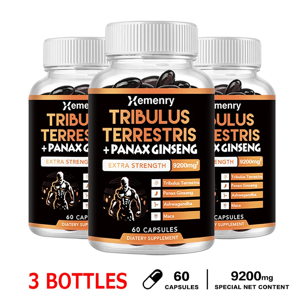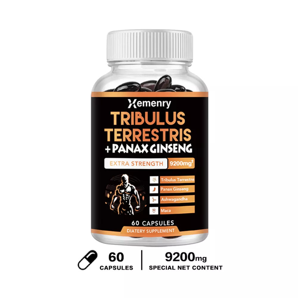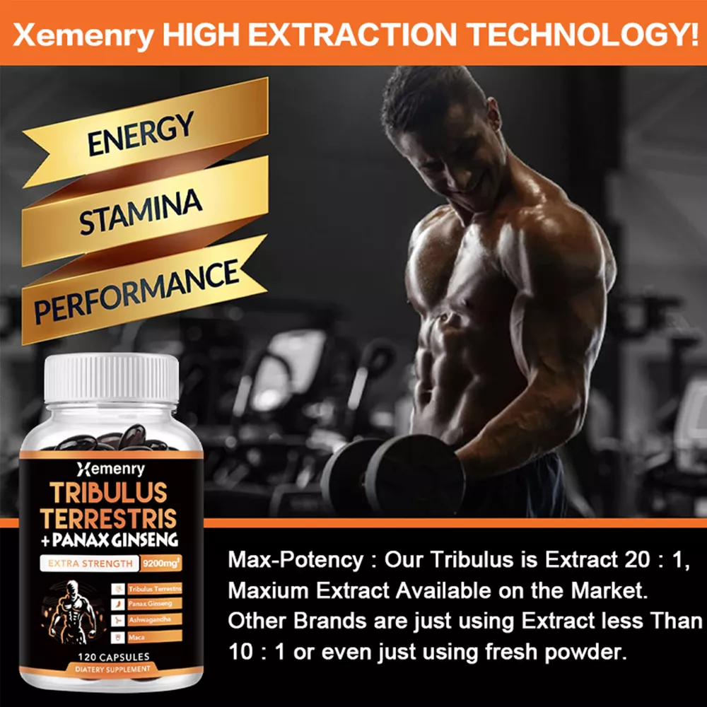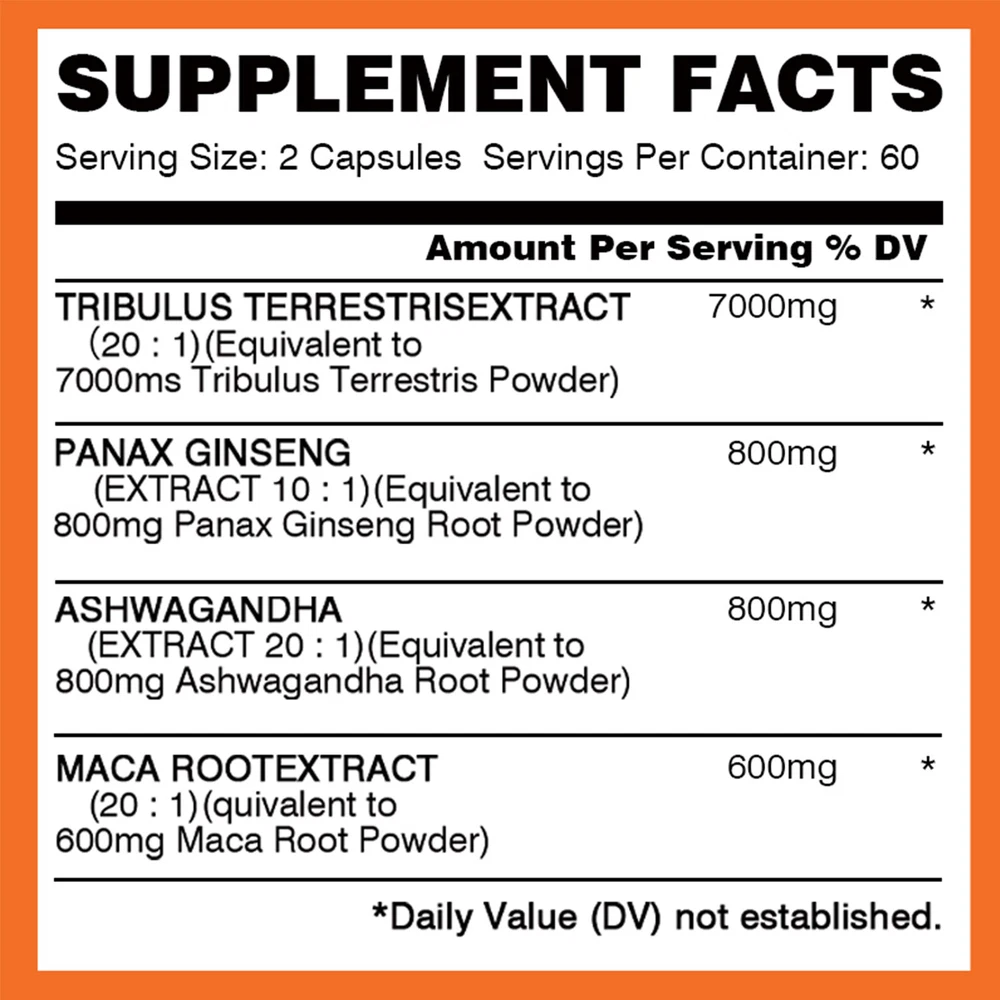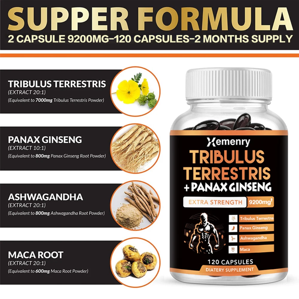 Effects: Testosterone Booster, Energy & Endurance Ingredients: Tribulus Terrestris, Maca, Ginseng, Ashwagandha Directions: Take 2 capsules once daily after a meal. Shipping: Ships within 48 hours on working days. Shelf life: 2 years Description: Maximum Potency: Our Tribulus terrestris extract has a ratio of 20:1, the highest ratio on the market. Other brands only use less than 10:1 extract or even only fresh powder. SPECIALLY FORMULATED, 9200mg PER CAPSULE: It's one of the most potent Tribulus supplements on the market. Made with the highest quality ingredients, 100% natural, vegan, non-GMO, gluten-free and free of fillers, preservatives, binders or harmful chemicals. Products are third party tested and formulated in GMP certified facility to ensure their authentic and sustainable manufacturing process. Document