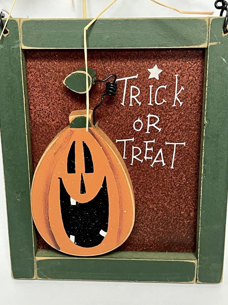Add some spooky flair to your home decor this Halloween with this small, vertical sign featuring a jack o' lantern and the words "Trick Or Treat". Made of wood and tin, this decorative piece has a 3D effect and comes ready to hang with a straw ribbon. The sign has a bordered design and metal tin backing, making it a great addition to any room. Perfect for teens, adults, and kids alike, this Halloween-themed sign will add a touch of festive charm to your home. Use it to decorate your front door, living room, or any other space in need of a little Halloween spirit. Don't miss out on this unique and decorative piece! CONDITION Pre-owned Good condition See pictures for details Please contact us with any questions or concerns. Thanks!