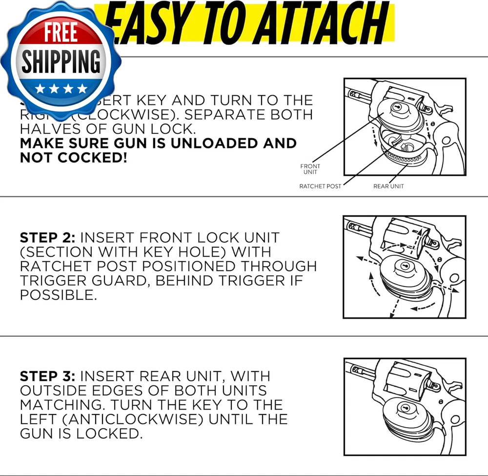 Trigger Lock, Gun Lock with Key, Adjustable Ratchet Mechanism, Easy-To-Attach Gun Locks with Protective Rubber Pads for Pistols, Rifles, & Shotguns CONVENIENT KEYED ACCESS: With two included keys per lock, you can always have a key handy anywhere around the house AVOID SCRATCHES AND DENTS: This trigger lock is equipped with protective rubber pads to ensure your gun's finish is protected from scratching FULLY ADJUSTABLE LOCK: Our product features an adjustable ratchet mechanism, making it a versatile trigger lock suitable for many pistols, handguns, rifles and shotguns EASY TO LOCK: The trigger locks for handguns and trigger locks for rifles and shotguns are designed to be easy to attach and lock, making them convenient and efficient for all gun owners ENHANCE YOUR FIREARM SAFETY: This versatile lock guards against accidental discharges and unauthorized use, offering gun owners peace of mind Experience the ultimate convenience with our CONVENIENT KEYED ACCESS system. Each lock comes with two keys, ensuring you always have quick and easy access to your firearms from any location within your home. This lock prioritizes safety and compatibility. While it effectively secures various firearms, it may not fit all models, particularly lever-action rifles, triggerless designs, guns with extra light or extra wide triggers or guns with trigger shoes or extensions. Remember, never use this on a loaded firearm, and discontinue use if the fit is loose or damage occurs. Say goodbye to worries about scratches and dents! Our locks feature rubber cushion pads that provide a protective barrier, safeguarding your gun's finish from any potential marring or scratching. Lock down your entire collection with ease! Whether you have a growing arsenal or a diverse collection of firearms, our security set is designed to quickly and securely lock down your ENTIRE collection. Simply order as many sets as you need for comprehensive firearm protection. Enjoy the flexibility of a fully adjustable lock that accommodates almost any firearm in your collection. From RIFLES and HANDGUNS to PISTOLS and SHOTGUNS, our locks are meticulously crafted to provide a secure fit for various firearms, ensuring the safety you need. Order with confidence knowing that our trigger locks are built with the highest quality materials. The steel and zinc body guarantees maximum durability, while the 4-pin tumbler enhances pick resistance, providing you with a reliable and secure firearm storage solution. Invest in the best for your firearm collection – choose our Premium Firearm Security Set for unparalleled convenience, protection, and confidence Warranty Description 90 days Item Dimensions LxWxH 3 x 1.5 x 4.5 inches Color Black Material Aluminum Package Weight 0.17 Kilograms Suggested Users unisex-adult Model Name Trigger Lock Item Package Dimensions L x W x H 7.95 x 5 x 0.55 inches Included Components Trigger lock Shipping Fast shipping is very important for us. Our standard US shipping service is FREE. Your order will be shipped within 2-3 business days upon full payment received. Your order will be delivered within 2-3 business days after the handling time. We only ship to the confirmed PayPal address. We reserve the right to cancel any order for any reason at any time. We are not responsible for undeliverable addresses. Returns and payment We offer a 30 days return policy from checkout winning date. We allow only PayPal as payment method FeedBack Your feedback very important to us, after you get your package and you are satisfied with our service please leave us positive feedback If you have any problem with your order / any questions please before leave any type of feedback Please visit our eBay store to check out other items for sale! Thank you for shopping at our store.
