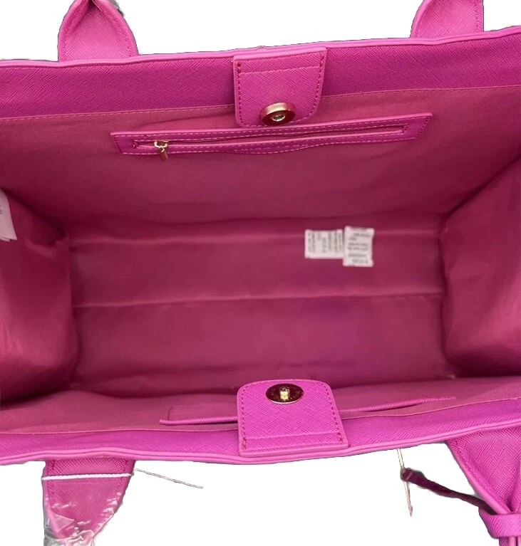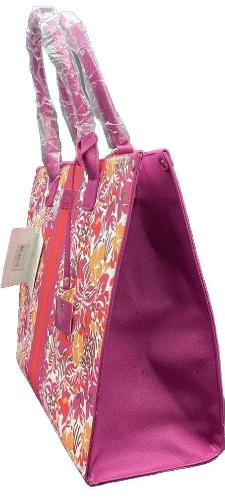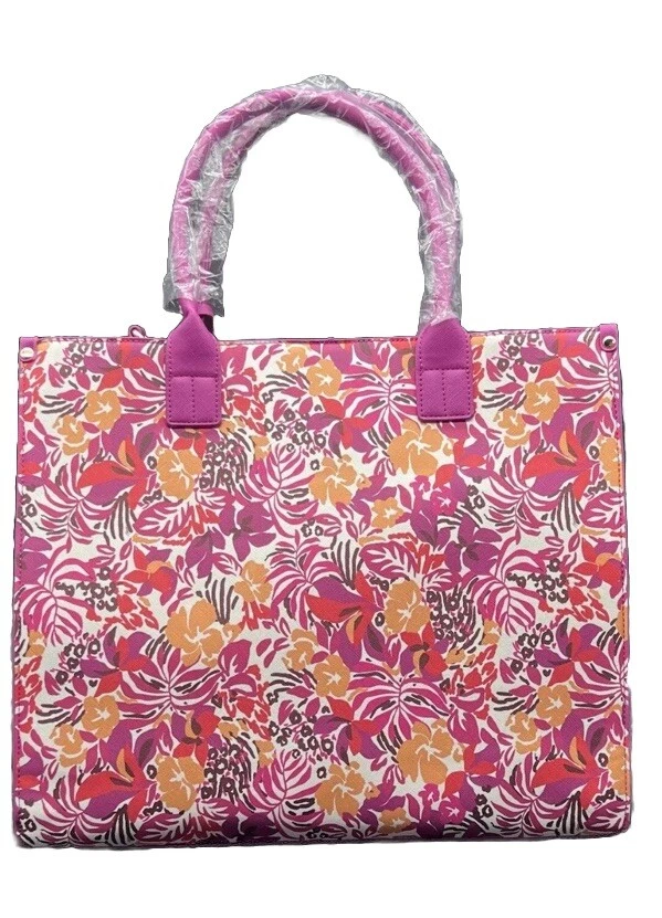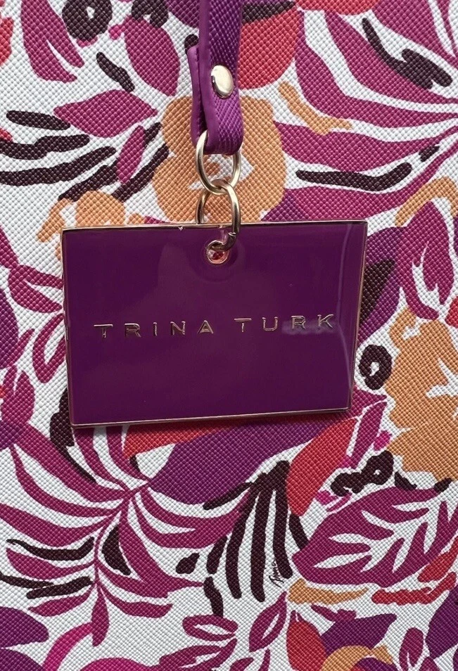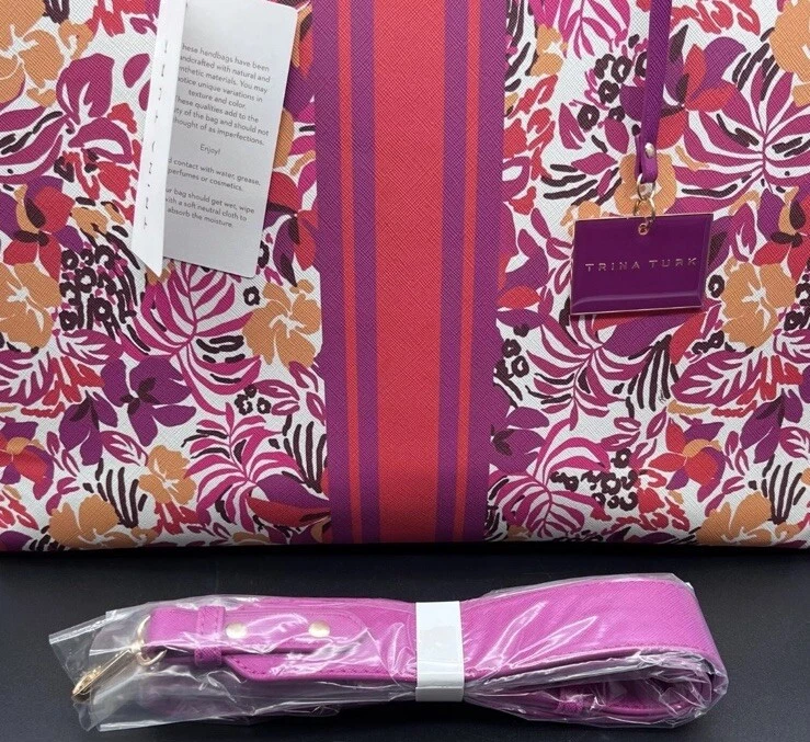 This Trina Turk Tote is a stylish and versatile bag suitable for travel and workwear. The bag has a rectangular shape with a snap closure and double handles. It is made of faux leather in a colorful floral pattern and features gold-plated hardware. The bag has a large size of 16.5 inches in width, 14 inches in height, and 7 inches in depth. The bag comes with a detachable strap and a bag charm. It also has several features such as an adjustable strap, inner pockets, and a lined interior. The bag is suitable for those who love colorful and stylish accessories. This Trina Marjorelle model is a part of the Trina Turk Tote product line, made in China with high-quality fabric lining.