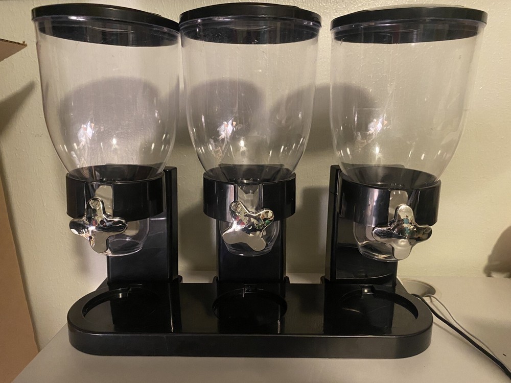 Three container dry food dispensers on plastic mount. Will ship disassembled.