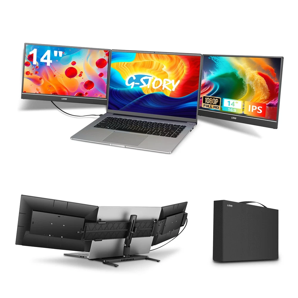 [14-inch Dual Screen for Laptop] laptop screen extender offers a 1920x1080 resolution and 72% NTSC color gamut, providing a bright and high-quality viewing experience. This monitor extender allows for independent backlight brightness adjustment, ensuring friendly eye protection and reducing fatigue. [Widely Compatible] The triple laptop screen extender fits 13"-17.3" laptops. Compatible with Windows (support 7/10 v1607 and above/11), Mac ( support M1/M2 chips, need to install the driver). If you are not sure whether your laptop is compatible, you can get in touch with us to provide you with a solution and we will reply within 24 hours. [Triple Screen Laptop Monitor Extender] This portable laptop screen extender helps you multitask effectively by opening multiple applications simultaneously. It is perfect for home offices, remote workers, frequent travelers, online meetings, IT professionals, gamers, and more. By attaching dual extended screens to your laptop, you can enhance your productivity by up to 300%. [Perfect for Travel] Upgraded travel monitor for laptop 2 screens comes with a foldable stand and portable bag. Use the adjustable kickstand to find your favorite angle for working, playing games, or watching movies. With a single cable connection, you can say goodbye to multiple data cables and messy workstations. [Important Information Before Purchase] 1. For macOS, please use the provided USB disk drive to install the driver. Windows systems typically install the driver automatically. 2. If you experience issues such as only one screen displaying, screen flickering, or a black screen, it may be due to insufficient power from the laptop. Please connect an additional power source for the screen.