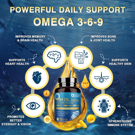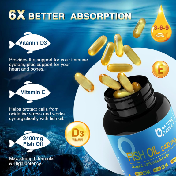 Triple Omega 3 6 9, Fish Oil 2400Mg Softgels with Vitamin D3 & E - EPA & DHA & A US Warehouse - FREE & FAST Shipping in US Product Description: These statements have not been evaluated by the FDA. This product is not intended to diagnose, treat, cure, or prevent any disease or health condition. HIGH CONTENT FORMULA FOR MAXIMUM BENEFITS - Unlike most fish oil supplements on the market, fish oil contains higher levels of fatty acids, with 2 softgels taken daily providing 2400mg of fish oil, 1530mg of Omega 3 (including EPA, DHA and ALA), 130mg Omega 6 and 320mg Omega 9. Promotes heart, skin, joint, eye, brain and immune health. OPTIMUM ABSORPTION - Omega 3-6-9 with CoQ10 combines heart healthy essential fatty acids with the antioxidant and cellular energy production capabilities of Coenzyme Q10 – all the benefits of two great products in one easy-to-take gelcap for synergistic support and enhanced absorption. Take the Triple Omega 3-6-9 softgels with a meal for optimal absorption. PURE & HIGH POTENT - Our fish oil dietary supplement uses a state-of-the-art purification process to remove mercury, making it free of potentially harmful contaminants. Each softgel has an advanced delivery system that eliminates the fishy aftertaste/burps and ensures better absorption. Our softgels are unflavored and have no lemon flavor, no added fragrance, making it an easy addition to any wellness routine! TRIPLE STRENGTH OMEGA 3 6 9 FISH OIL - Our fish oil is a quality, sustainably sourced formula containing the 6.8mg of vitamin E and 100 IU of vitamin D3 . Vitamin E helps protect cells against oxidative stress. Supplementing both vitamin E and fish oil may be more effective than either supplement alone. And our specialized formula of fish oil and vitamin D3 supports your immune system, as well as your heart and bones. Assisting with the maintenance of general health and wellbeing. we know how important a clean, healthy experience is to you and your family. You can trust that we do our best to protect marine living resources when sourcing raw materials. That's why we use only the best ingredients when making our fish oil. Our quick release softgels are non-GMO, gluten-free, dairy-free, and contain no artificial colors, flavors, sweeteners or preservatives, ensuring our fish oil is the purest, freshest, and most ecological. Feedback: 1.Any question for your order, please contact us in time, we will reply to you within 24 hours and give you a satisfactory answer. 2.If you are satisfied with our products and services, hope to take up your a little precious time to leave feedback reviews for our products.Thanks! 3.Your satisfaction is our effort. Welcome to order again! Have a great day! Our Policy: 100% Satisfaction Guarantee 20% of restocking fee will be charged for return item