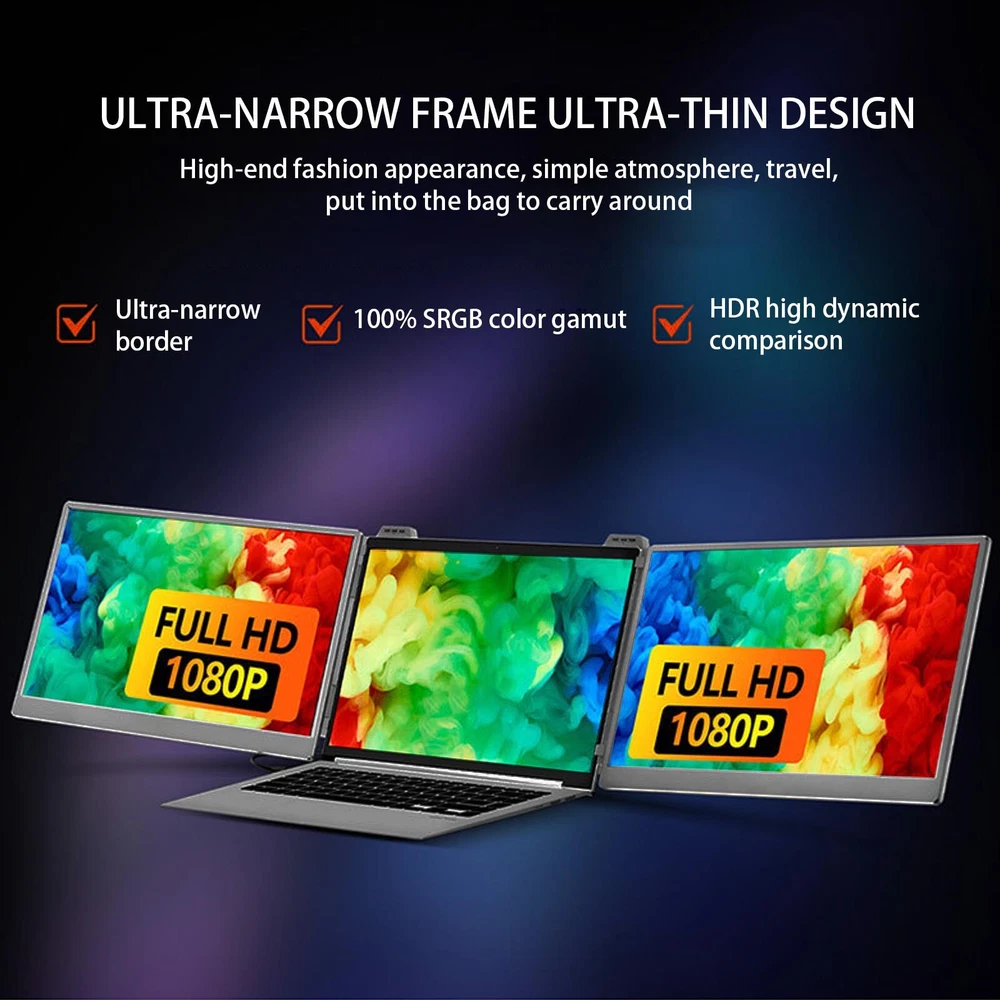 15.6-inch portable triple-screen display 1080P laptop dual display extender titanium color Three-screen display, efficient office: office, design, editing and entertainment are carried out at the same time, and work efficiency is rapidly improved. One-line direct connection: No need to install drivers, two displays can be connected with only one Type-C data cable. Rotatable bracket, angle can be adjusted The screen can be rotated at multiple angles, left: 0-210°, right: 0-210° Ultra-narrow frame and ultra-thin design High-end and fashionable appearance, simple and atmospheric, travel on business, put it in the bag and carry it with you Ultra-narrow frame 100% SRGB color gamut HDR high dynamic contrast 15.6 inches: recommended laptop size: 15.6”-16.1” Length (left to right): 310-375mm Width (top to bottom)>165mm Computer display thickness<8mm Payment: The buyer is responsible for any applicable import duties and local taxes. Usually there's not any charges for small parcel. But please verify with your customs before making your purchase. Return: If you are not completely satisfied with your purchase, simply return the item to us in its original condition within 14 days of receipt. We will issue a full refund on receipt, excluding the return delivery charge. About US: We are a professional foreign trade e-commerce company, mainly engaged in foreign trade B2C platform business. Our foucs includes instrument meters and accessories, household items, car accessories, Led lighting etc. Our company is energetic and creative and wish to bring you great service and amazing experience.