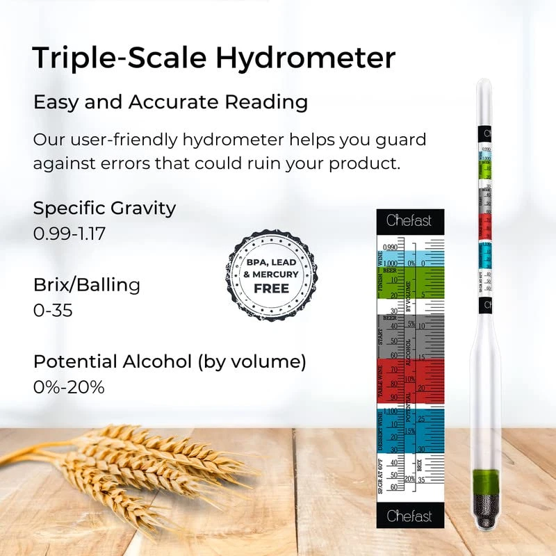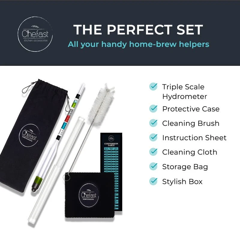 THE PERFECT HYDROMETER TEST JAR SET: Whether your forte is beer, wine, mead or kombucha, make sure your, sugar, and gravity measurements are right in the sweet spot with this combo kit. Our user-friendly hydrometer helps you guard against errors that could ruin your product, while our EXTRA THICK & NARROW glass test jar helps you waste less of your precious home-brew and get the best readings every single time. EASY, SAFE AND ACCURATE: Measuring specific gravity from 0.99-1.17, brix/balling from 0-35 and potential by volume from 0%-20%, this essential proofer is easy to read and free of mercury, lead and other hazardous compounds. It’s your environmentally-friendly way to make pinpoint measurements of your home brew. Please Note: Our hydrometer will NOT work with maple syrup, moonshine, or other content home distilling beverages. SPECIAL EXTRAS INCLUDED: In this tester kit, we’ve also included a few handy home-brew helpers that could really save the day. The cleaning brush will make short work of cleaning your glass test tube and other brewing equipment; the cloth helps you keep the hydrometer clean; and the canvas carry bag keeps it all together so you’re not running around hunting for a key component. AWESOME GIFT FOR HOME BREWERS: Is there someone in your life who loves to brew their own, but you wonder whether they have the quality equipment they need for making accurate measurements? This combo kit comes in a stylish box, and it is a great gift that could be just what they need to brew with the best of them. Plus, the attractive box keeps everything organized and safe while it is on its way to you. Product Description Analyze and Optimize Have you been bedeviled by inconsistent product when you home brew? Are you searching for a hydrometer that’s incredibly accurate, easy to read and friendly to the environment? Are you lacking some handy home brewing items such as a multipurpose cleaning cloth? Then the Homebrew Helper Kit by Chefast is For You! All You Need and More With a triple-scale hydrometer plus a few extra helpers, our combo kit is exactly what a serious home brewer needs to scientifically ensure that their product is within parameters. Now all that’s left is to play around with the flavor profile to create a concoction worth putting your name on! Hydrometer Specifications Specific Gravity: 0.99 - 1.17 Potential By Volume: 0%-20% Brix/Balling: 0-35 3 Reasons to Choose The Chefast Hydrometer Kit Handy Extras In addition to the essentials, the Chefast Homebrew Helper kit gives you a few more items that no brewer should be without. The hard-cover case protects your hydrometer when not in use; the cloth keeps it free of outside particles; and the canvas carry bag helps you keep everything in one place. Just What the Brewing Experts Ordered Whether you yourself are looking to up your brewing game or you know someone who is interested in home brewing but who needs to get their feet wet, this combo set is a no-brainer. And at this price, there’s no excuse for any brewer to be without this ticket to homebrew nirvana. Accurate Testing for Beginners and Beyond We even include an instruction sheet to show beginners what they should be looking for when reading their hydrometer. Whether you brew beer, wine or Kombucha, this kit can help you improve your product.