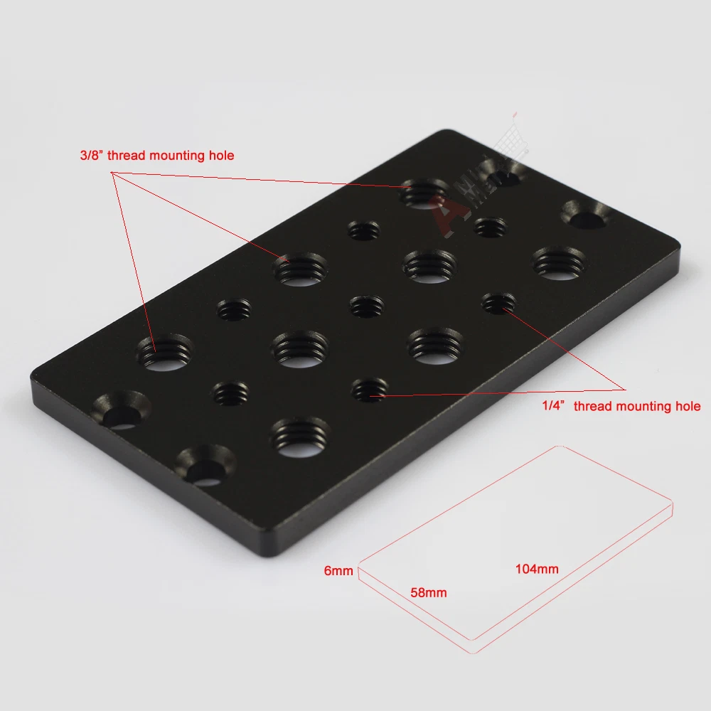 Tripod Mount Base Cheese Plate fr Rail System 15mm Rod Support DSLR Rig Clamp B Features: The tripod mouning base cheese plate designed originally for 1/4" and 3/8" threaded hole adapter,It also works for DSLR rig as a simple base plate after mount on to the quick release plate / ballhead / tripod. There are 7x 1/4" and 8x 3/8" threaded mounting holes for tripod and ballhead. Made of aluminum, Glass bead blasting and anodizing black aluminum. Specification: * Name: Tripod Mount Base Cheese Plate B * Anodizing black finish * Material: aluminum * Seven 1/4" threaded mounting holes * Eight 3/8" threaded mounting holes * Made by CNC machine * Size (L*W*T): 104mm * 58mm * 6mm * N/W: 84g * Spacing between two flat screw holes:20mm Package contains: 1 piece of Tripod Mount Base Cheese Plate B Please take 3 seconds to read: PayPal accepted only. Only ship to Paypal confirmed address, please update your PayPal shipping address. Payment must be made within 3 days after auction closed. Sales taxes, additional COD charges, VAT, Customs fees, and Duty for importation in your country will be on you, if any. Shipping and handling: * Item will be shipped within 1-2 business days after payment is clear. * Item will be shipped by Air mail (HongKong, China, Singapore or Swiss Post, I post items by logistics agent.), if you need tracking service, please pay extra $3. Your cell phone number is helpful when carrier deliver package to you. * I ship items to worldwide. Italy and some eastern European countries, Please check shipping service with me. Note: * Shipping time is different to different country, it is up to the weather and customs. Shiping time (FYI): -- 18-27 working days in general -- 12-21 working days: Asia countries -- 4-6 working weeks: Russia / Mexico / Brazil / South America ( stricter Custom Inspection ) -- 3-5 working weeks: Portugal / Czech / Spain / Germany/ Eastern Europe ( stricter Custom Inspection ) Service and Return Policy: You get 6 month guarantee from sales date, Always Buy from me with confidence ! Please contact with me asap, if you have any question. Your satisfaction is most important to me, I am eager to answer your questions. Working time & contact me: 9:00am to 5:00pm Monday to Friday E-mails will be answered within 24-48 business hours.