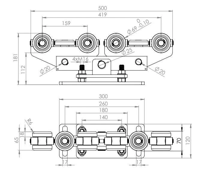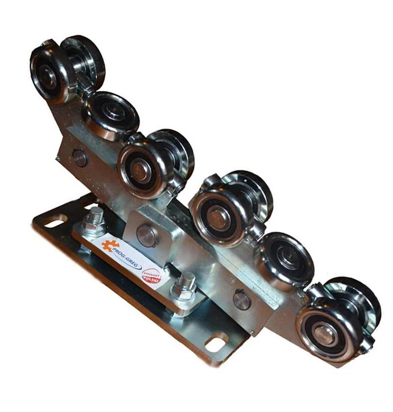 80x80x5 sliding door trolley with 2 adjustable feet Price for 1 trolley! The correct functioning of the gate requires the installation of 2 bogies and only then can we guarantee smooth and easy operation, regardless of the quality of the gate itself You have the problem that the door runs heavily or gets annoyingly stuck at some point. The cause could be a poor running trolley The guides that make the gates are not perfect. They can still twist months after installation. This can be caused by stresses during profile making and the welds themselves. Our drives are resistant to these types of problems thanks to the use of 2 torsion-independent joints on the guide rollers that compensate for the unevenness of the tread. Our customers swap out classic trolleys (with rigidly attached castors) with our trolleys if their door is jammed or damaged (a courier driving their car backwards did not notice and hit the door). Almost 100% of the time the problem is solved by replacing the cars. It happens very often that the gate is difficult to move over a certain distance. Adjusting the classic bogies will not have the desired effect in many cases, and the only solution is to heat the track and straighten it manually. This will damage the paint and galvanizing. This will only half solve the problem as the door can be “straightened” but after some time the problem will return. Don't let this type of solution fool you. Have the door installed by the manufacturer on a pendulum chassis with a joint. An investment, and you no longer have to deal with the problem of a sluggish gate. NOTE! The specified rail dimension is calculated on the outside, not in the middle of the profile. This auction is for a car for the profile 80x80x Technical Parameters Pin spacing in bench A=170mm W=70m Additional 2 bases to facilitate height adjustment of the door All elements are made of high quality steel and galvanised The cars come with bearings 6304 2RS equipped , the largest size available, which protect them very well against the accumulation of sand and other contaminants The weight of a car is 10k The load capacity of the trolleys is up to 2500k The guide rollers are made of very high quality material, with increased hardness and abrasion resistance The construction is designed to disassembled each item and can be replaced with another one if needed. In many cases, when replacing a standard bogie with an articulated bogie, it is sufficient to remove the central bolt connecting the base to the body and replace it with ours. The only condition is that the thickness of the body of the previously installed bogie is 12mm and the diameter of the center bolt is 20mm (in most cases, these parameters are met). Advantages of sleds ● the guide profile can be twisted, welded together; this does not affect the function of the carriages . The gate continues to glide easily along its entire length. ● The door itself may be warped, negligent or inaccurate; this does not affect the function of the carriages. ● the load is always evenly distributed between each of the four rollers, none of the wheels will ever be overloaded How do the drives adjust the height? When assembling the gate itself, it is necessary to adjust the carriages to different heights. Often the foundation is not evenly cast. We have our trolleys with a 2. Base equipped to facilitate the height adjustment of the gate. It is less and less problematic to put the door slightly higher by mounting it as shown in Figure 9 than to forge the foundation if the gap under the door is too large. Drill holes in the bench, e.g. for m1 pins. Attach them permanently, e.g. B. with a chemical anchor. Attach the first base directly to the benches. The second base is used to bring the door to the correct height Fitted with nuts from top Why these trolleys? Our many years of experience in the fence industry have led us to develop a cart with such possibilities. Many times we have installed a gate manufactured with the utmost care and despite tedious adjustment of the carriages, the gate moved only with resistance, e.g. from the middle of the gate to the end. After adjusting the drives in this position, the gate moved slightly on this section, on the section from the center to the opening where it had previously moved slightly, but with resistance. This is a typical behavior of a gate with a warped rail profile or the gate itself. Such a door cannot be adjusted to normal trolleys! What causes deformation of the guide rail and the entire door? The standard and most common door profile (channel profile semi-closed 80 x 80 x 5 slot 27.5) is cheap and solid. Unfortunately, during production, stresses are introduced into the steel structure by rolling, which together with the welds distort the profile. The stresses are easy to see when you cut through the profile and the ends “loosen” due to the stresses. Prefabricated profiles with a "twist" are also common (Fig. 4). A twist of only 5 degrees completely blocks the gate on normal trolleys and is virtually invisible at a length of 6 m. The door profiles of the various manufacturers are usually produced by rollers. A press brake does not introduce torsional stresses, but is much more expensive. The deformation of the entire gate, which affects its movement, consists in the rotation of its plane, so that the guide profile and channel of the guide roller are not flush (Fig. 5). In this case, the guide roller pulls the door to one side or the other of the cart. A common problem, especially with long doors Construction Since the carriages are designed for heavy loads, the guide rollers are metal only and profiled so that the load is always transferred to the center of the bearing. They come with hermetically sealed , equipped waterproof bearings that are sealed with a metal-rubber seal (and not just a metal plate) to ensure that dust and moisture do not get inside and the grease contained does not age. The bearing size is the largest th