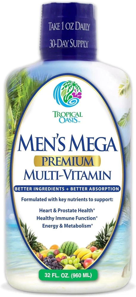 Premium Liquid Multivitamin for Men | Sugar Free Men’s Multi-Vitamin | 100+ Vitamins, Minerals & Amino Acids to Support Muscle, Heart, Brain Health & Energy | 98% Absorption Rate | Non-GMO | 32 Serv Brand Tropical Oasis Flavor Unflavored Primary Supplement Type Vitamin A, C, D3, E, B1, B2, B3, B6, B12, Folate, Biotin, Iron, PABA, Choline, CoQ10, Grape Seed Extract, Quercetin, Colloidal Minerals Vitamin A, C, D3, E, B1, B2, B3, B6, B12, Folate, Biotin, Iron, PABA, Choline, CoQ10, Grape Seed Extract, Quercetin, Colloidal Minerals Unit Count 32 Fl Oz Item Form Liquid Item Weight 32 Ounces Item dimensions L x W x H 3 x 3 x 8 inches Special Ingredients Vitamin A, C, D3, E, B1, B2, B3, B6, B12, Folate, Biotin, Iron, PABA, Choline, CoQ10, Grape Seed Extract, Quercetin, Colloidal Minerals Vitamin A, C, D3, E, B1, B2, B3, B6, B12, Folate, Biotin, Iron, PABA, Choline, CoQ10, Grape Seed Extract, Quercetin, Colloidal Minerals Diet Type Gluten Free Product Benefits Anti-Aging About this item ✅ Tropical Oasis New Men's Mega Liquid Multivitamin is specially formulated for Men with premium vitamins, minerals, herbs, amino acids, and nutrients that will keep you feeling young and living an active lifestyle ✅ Additional 1000mg herbal blend of Nettle Root, Ashwagandha Root and Saw Palmetto for optimal prosate health ✅ CoQ10 is a vital nutrient manufactured by your body that helps cells produce energy. As we age, our body loses its stores of CoQ10, particularly in the heart. Taking CoQ10 helps maintain your healthy CoQ10 levels and is also recommended for those suffering from high blood pressure ✅ Contains Double the Daily Recommended Value of Vitamin D for men! ✅ Liquid Vitamins are absorbed up to 98% by the body compared to 3-18% for pills/capsules - No artificial colors or flavoring.