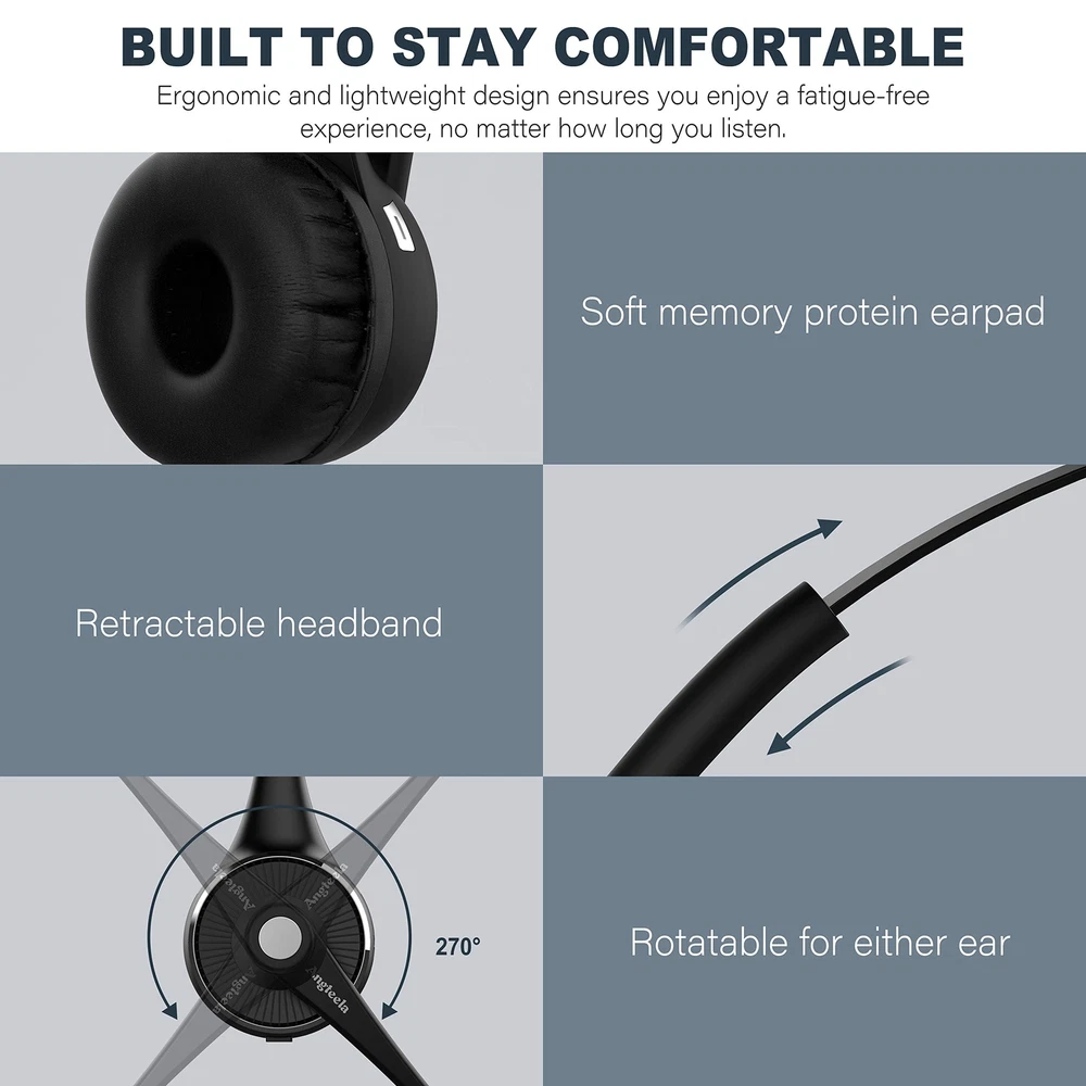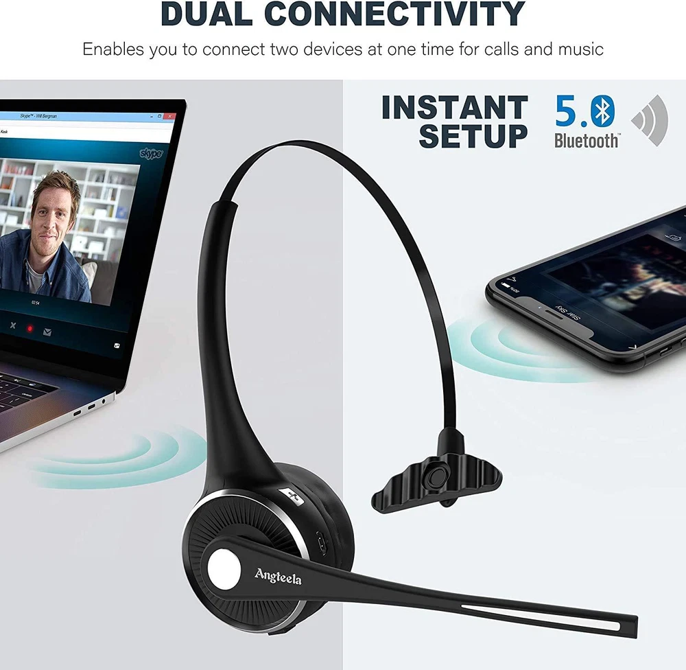 【NOISE CANCELING MIC】 - Advanced noise-canceling technology isolates your voice from the noise around you, so you can stay focused on what you want. 270° flexible mic can be positioned for better voice capture and background noise reduction. Provide crystal-clear conversations even in the busiest work environment. Perfect for when you’re working or studying from home or taking conference calls, in the car and outdoor. 【CREATED FOR COMFORT】 - Weights only 1.7oz, featuring with balanced over-the-headset design and soft protein memory-foam padding, the headset provide you comfortable wearing experience for intensive all-day use. Designed with stretchable headband, you can adjust it to a suitable width according to your head's size. 【EASY CONTROLS & MUTE FUNCTION】- Angteela wireless bluetooth headphones provides an intuitive and simple interface to adjust volume, play/pause music, and answer/end calls. One key to power on and enter pairing mode, wake up Siri, etc. Just press the “+” and “-” buttons simultaneously to mute your microphone, you can easily block the sound in your side during a conversation when needed. 【MULTI-POINT CONNETCTION & WIRELESS FREEDOM】 - Widely compatible with most Bluetooth-enabled devices, like cellphone, computer, tablet and laptop, etc. Simultaneously connect any two Bluetooth devices via Bluetooth 5.0 and seamlessly switch between the two at will. The 33 feet wireless range provides freedom to roam while staying connected. Transition between phone chats, video conferencing or music throughout your day—all with the same headset. 【TALK ALL DAY & 3 YEAR WARRANTY】- With up to 15 hours of talk time, Angeteela trucker wireless headset allows you make reliable wireless calls throughout the day on a 2- hour single charge. Designed with a sleek magnetic charging base, you can easily drop it in for a charge and storage, you can also charge the headset with the usb cable directly. 3 YEAR WARRANTY & always-ready friendly customer service ensured.