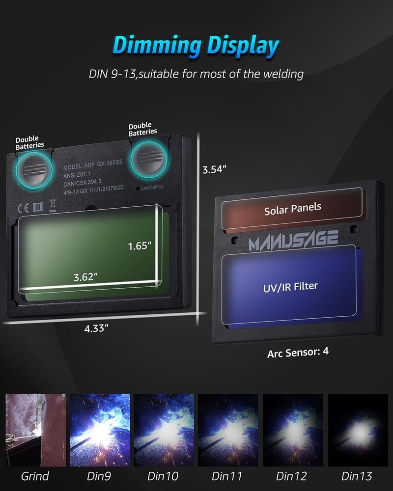 True Color Auto Darkening Welding Helmet | Solar + Battery for MIG TIG ARC Description True Color Auto Darkening Welding Helmet | Solar + Battery for MIG TIG ARC Weld with precision and protection using this advanced auto-darkening welding helmet —designed for performance, comfort, and durability. 🔧 Flexible Adjustment for Every Task Equipped with fully adjustable sensitivity and delay settings , this helmet adapts to different work environments. Grind Mode: Shade range 5–8 Weld Mode: Shade range 9–13 Switch modes quickly to match your job. ⚡ Advanced Auto-Darkening Technology The high-speed auto-darkening filter reacts in just 0.1 to 1.0 seconds , protecting your eyes from harmful rays and bright arcs instantly. Get True Color technology for better clarity and color visibility during work. 😌 Ergonomic & Comfortable Design Crafted with user comfort in mind: Spacious interior for easy head movement Padded headband for long working hours External adjustment knob for quick tweaks without removing the helmet ☀️ Solar-Powered with Battery Backup Enjoy continuous power thanks to solar cells and replaceable batteries —no downtime, no hassle. Work efficiently without worrying about recharging or battery changes. 👁️ Wide Viewing Area Gain full visibility with: Viewing Area: 92 × 42 mm Outer Lens Size: 110 × 90 mm Offers a clear, wide field of view for precise welding and grinding. ✅ Perfect for All Welding Types Ideal for MIG , TIG , ARC , and plasma cutting . Whether you're a hobbyist or professional, this helmet delivers the safety and performance you need. Stay safe, see clearly, and weld like a pro. Upgrade your gear with this feature-packed welding helmet today! Payment Policy We accept payments through the eBay Managed Payment System. All major credit/debit cards and PayPal are accepted via eBay's secure checkout process. Shipping Policy We ship within 1 business day of receiving your order. Orders are shipped from the USA with free shipping. Estimated delivery time: 2-5 business days. All shipments come with a tracking number for your convenience. Return & Refund Policy We offer a 30-day return policy for your peace of mind. If you're not completely satisfied, you can return the item within 30 days of receipt. In case the item arrives damaged or defective, we will send you a replacement at no extra cost . Return shipping is paid by the seller , so you can shop with confidence. Feedback Your satisfaction is very important to us! If you are happy with your purchase, please consider leaving us positive feedback . About Us Welcome to our store! We are passionate about offering high-quality products at affordable prices. Our goal is to provide excellent customer service and a smooth shopping experience. Thank you for choosing us!