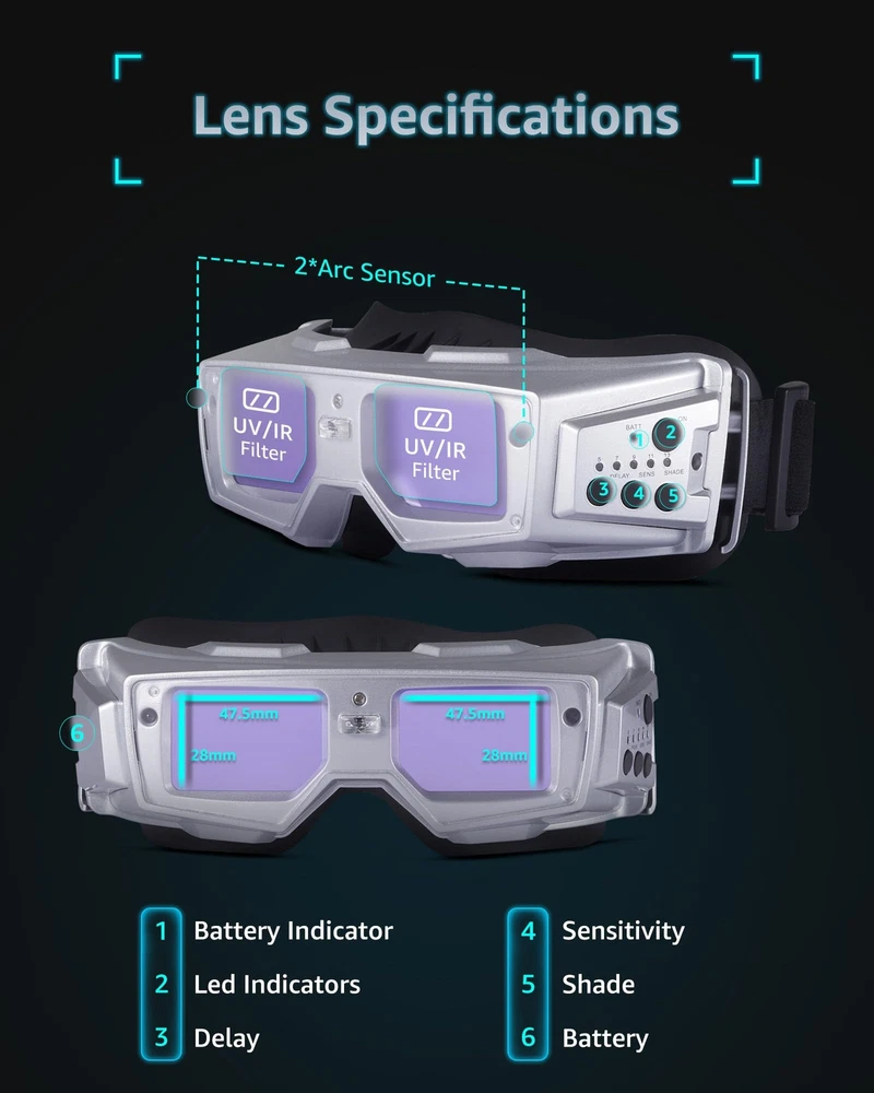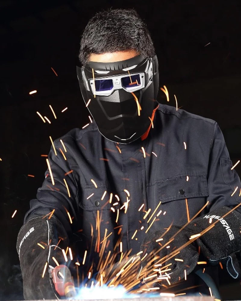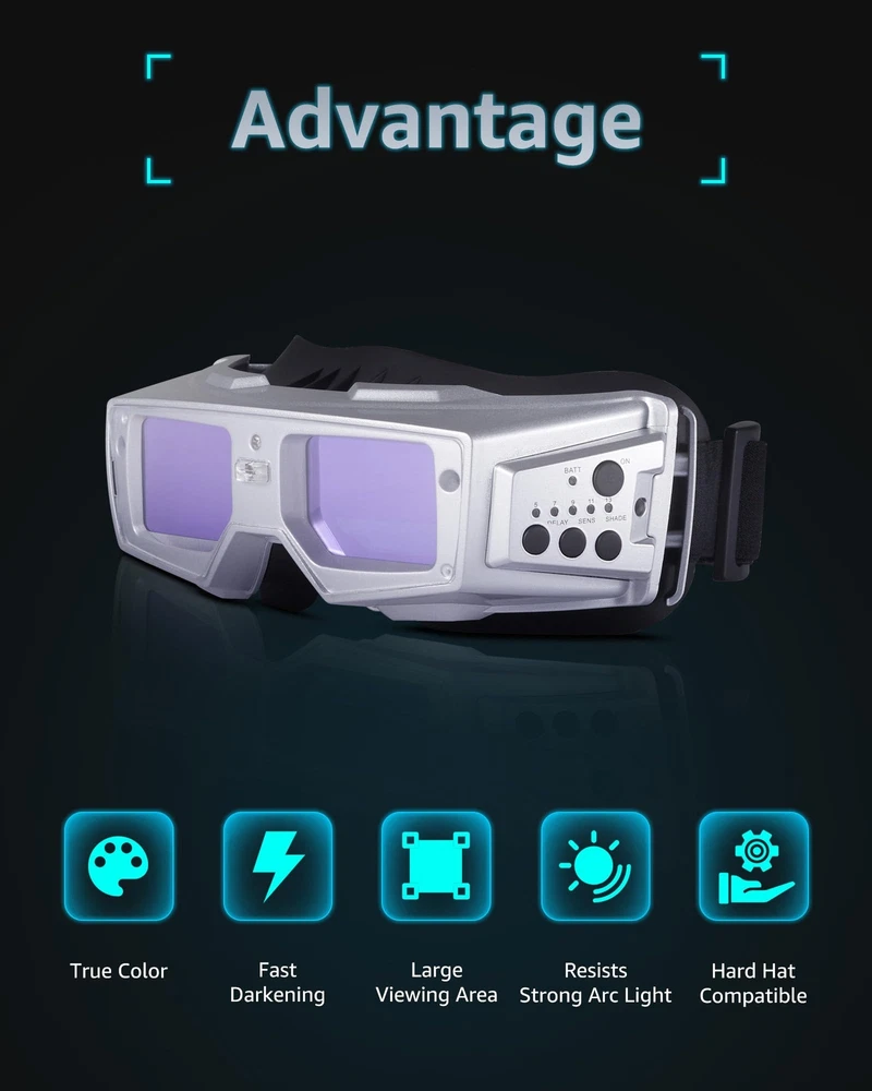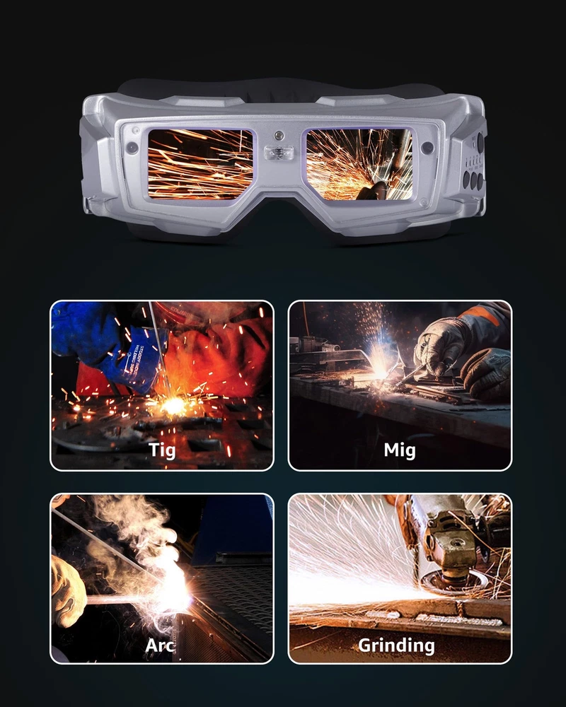 Auto Darkening Welding Goggles with the true color technology– improves visibility and reduces eye strain by minimizing the traditional lime green coloring in the helmet view screen.The combination of goggle and mask provide welding protection for you.Ideal for TIG MIG MMA. 【FLEXIBLE ADJUSTMENT】Our fast auto darkening welding hood has sensitivity and delay settings to accommodate various tasks and circumstances. Two modes: 5-8 range for grind and 9-13 for weld mode. 【ADVANCED AUTO-DARKENING TECHNOLOGY】Experience enhanced safety with our welding mask's quick-response filter. The transition from dark to bright between 0.1 to 1.0 seconds. 【COMFORTABLE TO WEAR】The design of welding hood adheres to ergonomic principles and offers plenty of interior space.Comfortable cushion and external adjustable button. 【SOLAR-POWERED CONVENIENCE】Enjoy uninterrupted welding with our solar welding helmet, designed for efficiency and eco-friendliness, eliminating the need for battery changes. 【WIDE VIEWING AREA】The true color welding helmet is equipped with 180-degree ultra large viewing area, enhancing precision in your welding projects.