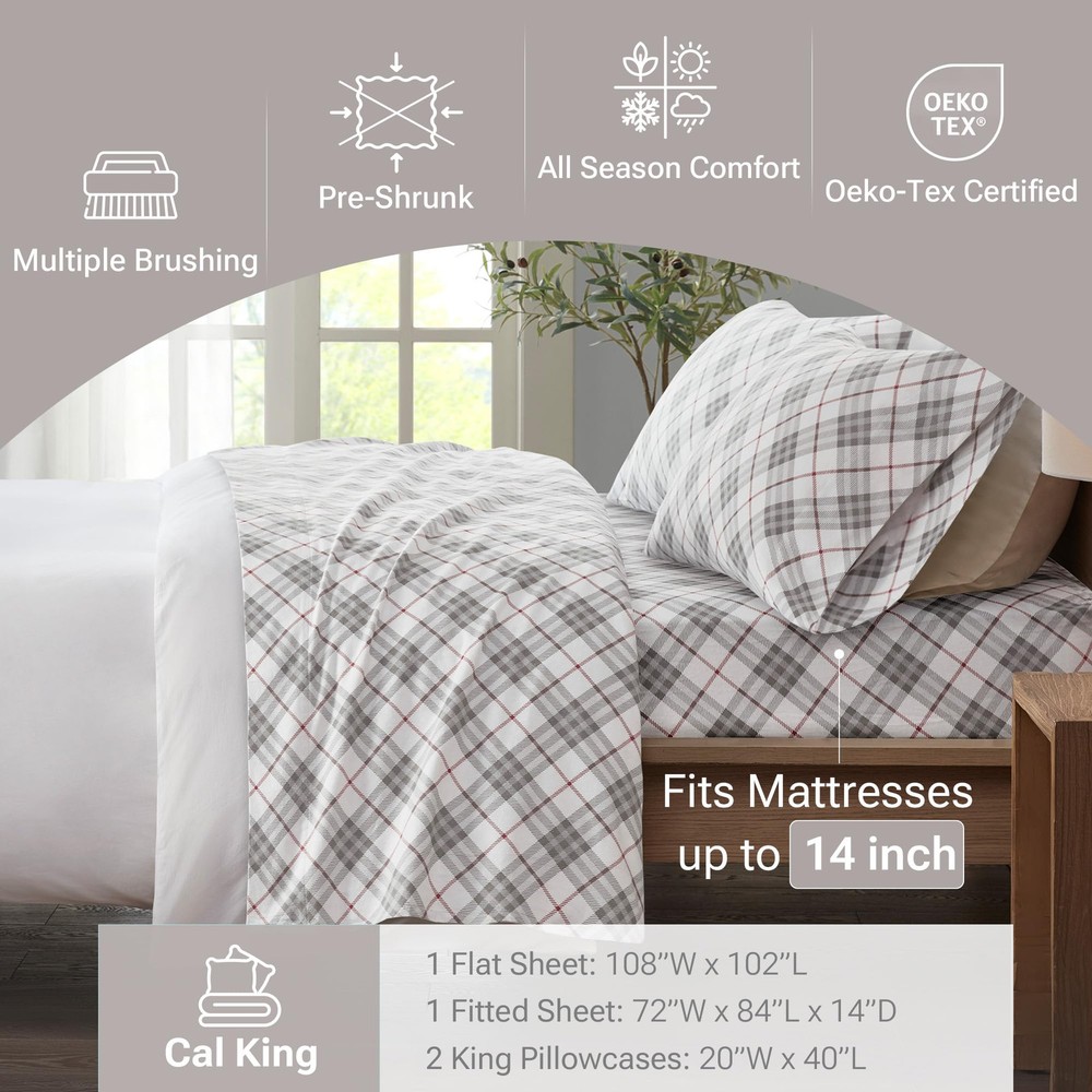 Keep warm and cozy with this ultra-soft cotton flannel sheet set, perfect for cold winter nights! Featuring a variety of prints these cotton flannel sheets provide a soft and inviting look. Machine washable for easy care. These cotton flannel sheets are also OEKO-TEX certified, meaning they do not contain any harmful substances or chemicals, ensuring quality comfort and wellness. Set includes: 1 Flat Sheet, 1 Fitted Sheet, 2 Pillowcases (1 in Twin/TwinXL sizes). The true north by cozy soft cotton flannel sheet set offers a charming and incredibly cozy update to your bedroom. Made from ultra-soft and warm cotton flannel, this cotton sheet set features a fun novelty print in soft colors, for an adorably comfortable look. Comes with all around elastic and fitted sheet fits up to 12 inches for Twin/TwinXL/Full, and 14 inches for Queen/King mattress height. Set includes: 1 Flat Sheet: 108"W x 102"L, 1 Fitted Sheet: 72"W x 84"L + 14"D, 2 King Pillowcases: 20"W x 40"L Easy care: Machine wash cold, tumble dry low. Avoid bleach. Lint is a natural byproduct of the brushing process that enhances softness and comfort. add a half cup of vinegar in the wash to help reduce shedding, which will subside after a few washes