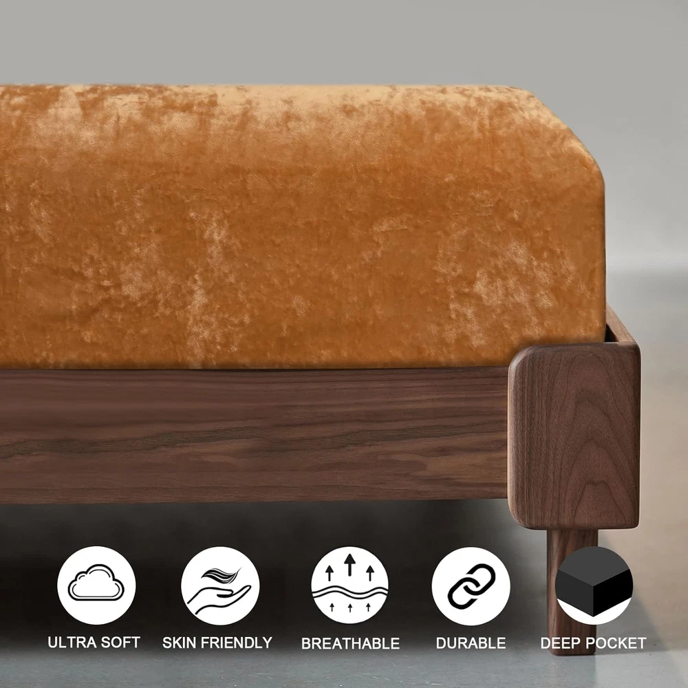 Chosen Velvet Fabric: The fitted sheet is made of 100% selected velvet fabric, fluffy, soft and skin-friendly, providing comfy and cozy sleeping experience for you and your family. Elegant Appearance: The velvet fabric with specail craftsmanship feature not only soft and uinform luster, but also amazing light and shadow effect in different light intensity and angle. Giving a luxurious allure for an impressive coordinating foundation with our premium velvet fitted sheet. Secure & Snug Fit: Measuring 80" by 60" with 15" deep pocket, our fitted sheet is designed for all queen sized bed mattress. With full and reinforced elastic band at backside, it will safely and securely cover your mattress. Easy Care: Machine wash separately in cold water, gentle cycle. Do not bleach. Tumble dry on low heat or lay flat to dry. Remove promptly. Warm iron as needed. No pilling, no shrink, no fade, no shed, labor tests show that the velvet fitted sheet keep its shape and stay brands new after 163+ wash cycles. Package Include: PHF Super Soft Velvet Fitted Sheet Queen(80" x 60" x15''), perfect for queen sized bed mattress. Product Description The video showcases the product in use. The video guides you through product setup. The video compares multiple products. The video shows the product being unpacked. Selected Velvet PHF fitted sheet is made of 100% selected velvet, sumptuously soft, fluffy and cozy, providing extreme comfort for sweet sleep. Due to a gentle textile process that ensures no shedding or pilling. 360° Extra Strong Elastic Each fitted sheet has full encased elastic band covered with self-fabric at the bottom, can fit your bed mattress snugly and safely without any shifting. 15 Inches Deep Pocket Our premium fitted sheet with deep pocket can stretches up to 15 inches, pull snugly over any mattress up to 15 inches effortlessly and simply, go neatly round the corners to stay in place. Easy to Use Its stretchy or elasticized edges make it a breeze to slip on and off, saving time and effort during bed making and changing linens. 1 Multiple Colors 2 Size Refrence PHF Luxurious & Cozy Fitted Sheet Material Truly Velvet Truly Velvet 100% Washed Cotton 100% Viscose Made from Bamboo Truly Velvet Size Twin/Full/Queen/King/CK Twin/Queen/King Twin/Full/Queen/King Twin/Queen/King Twin/Queen/King Color 10 Colors Available 6 Colors Available 12 Colors Available 11 Colors Available 5 Colors Available Price 28.99-37.99 25.99-32.99 21.99-27.99 25.99-35.99 26.99-33.99 Features Elegant Appearance, Soft, Warm Ultra Soft, Warm Cooling, Breathable Soft, Skin-friendly Soft, Skin-friendly Season Autumn,Winter Autumn,Winter Spring, Summer All Season Fall Winter and Spring