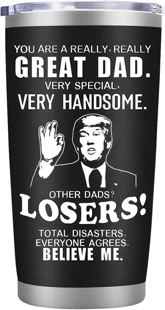 Funny GIFTS:This coffee tumbler 20 oz is very suitable for birthday,anniversary,Valentine's Day,Thanksgiving Day,Father's Day,Christmas and other important holiday or occasion to give to father. GIFT FOR ANY OCCASION:This insulated tumblers with lids is Perfect for office,party,vehicle and home.Imagine your father drinks coffee,water,beer from his new tumbler,He will tell you that you found best dad ever gifts for him HIGH QUALITY:This coffee insulated tumbler 20 oz have Featuring a leakproof cap. and This metal water mugs with lids is made from food-grade stainless steel,double-wall vacuum,durable,unbreakable,rust-resistant,keep your drinks ice cold longer and warm beverages piping hot CUP HOLDER FRIENDLY:The Christmas 20 oz dad tumbler design will fit most car,vehicle,bike,and boat cup holders TRAVEL READY:This 20 oz coffee dad tumbler can carry around your beverages whether out at the mall,soccer game,or park.Stay refreshed and hydrated no matter what adventure life takes you on Product Description UNIQUE FATHERS DAY GIFTS FROM KIDS The best present for dad at Christmas,Fathers Day gifts from son daughter,dad appreciation gifts,dad birthday gifts,Thanksgiving Day,Halloween,no matter the occasion. Delight he with the meaningful message and beauty of this unique present. VACUUMED INSULATED TUMBLER This tumbler body is made from 18/8 food-grade stainless steel,double-wall vacuum,durable,unbreakable,rust-resistant,Perfect for water, coffee, tea, beer, juice, ice cream, cocktails and more. The tumbler can keep drinking hot 5 hours and keep cold 9 hours. Keep your dad stay hydrated during a long activity day. A DAILY REMINDER OF YOUR LOVE There’s no present more necessary than an insulated tumbler. He will take this tumbler everywhere to enjoy he favorite drink.And proudly let people know this sweet gift is a congratulation from hIS child.The tumbler design will fit most car,vehicle,bike,and boat cup holders.