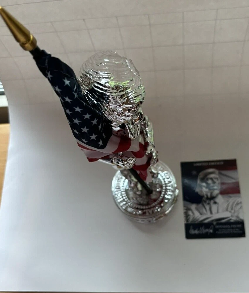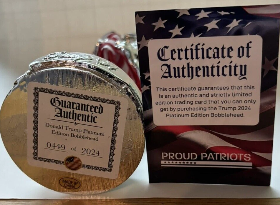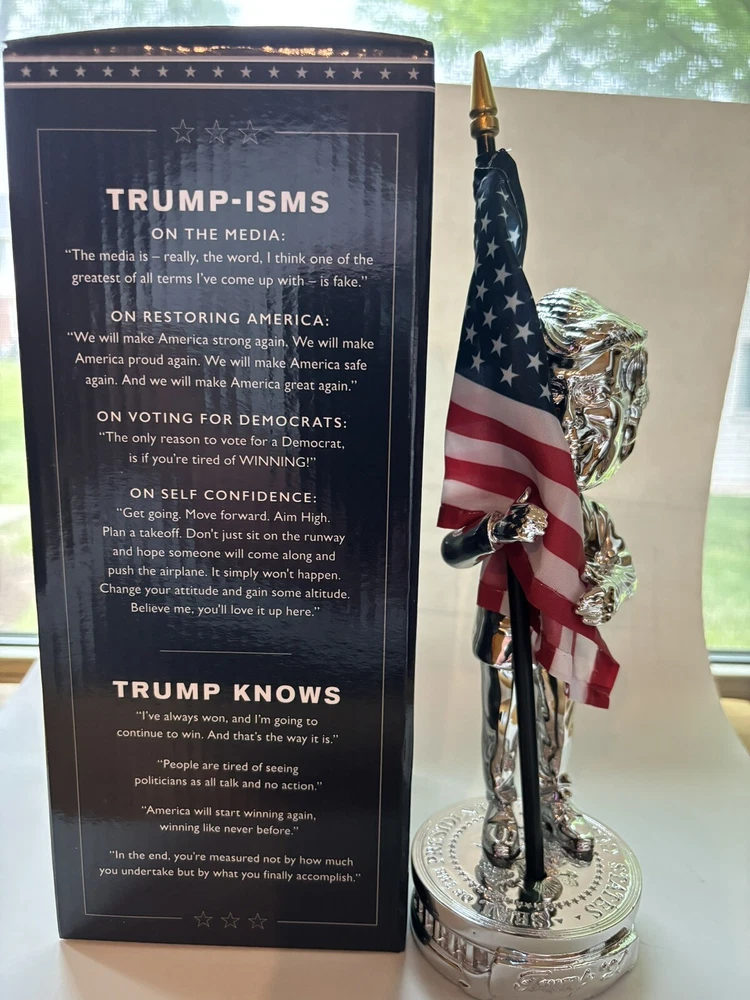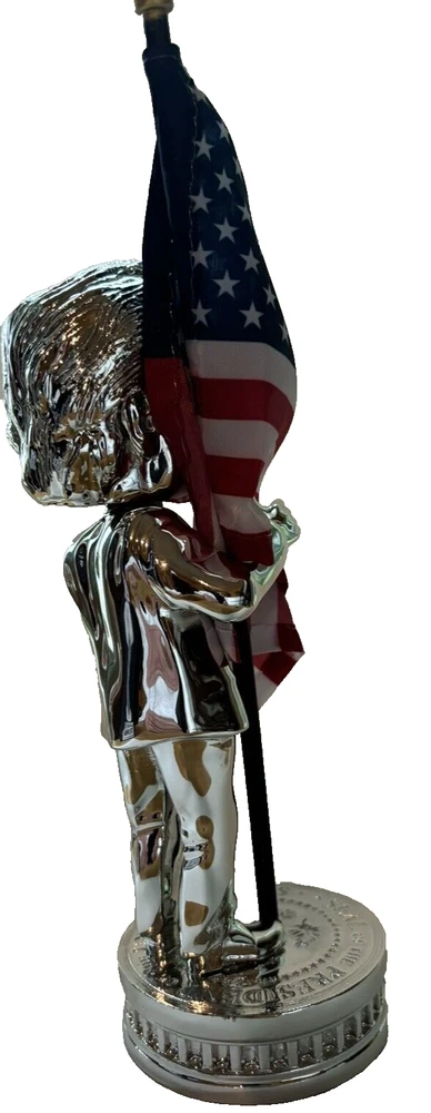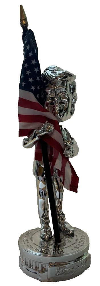 Explore the political memorabilia with the 2024 Trump Bobble Head - Platinum Version. A bold statement piece for any collection, this commemorative coin captures the essence of the 2020 presidential campaign era. Crafted from high-quality resin, it proudly stands as a tribute to the iconic 'President Trump Hugging the Flag' slogan. This collectible is a nod to contemporary politics, with its origins spanning across both China and the United States. While it is not a signed piece, its mere presence in a collection is a testament to the unique political landscape of the 2020s. Please note, this item is not associated with any California Prop 65 warnings.
