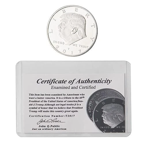 Return Policy Fast Delivery Trusted seller Trump Coin: 2017 President Donald Trump Inaugural Silver Eagle Commemorative Novelty Coin 38mm with Certificate of Authenticity Original Product Description First-edition, one-of-a-kind commemorative Donald J. Trump Coin (with CofA) for the 45th President of the United States. Proudly display alongside any MAGA hat , Trump Bobblehead, pen or T-shirt. Presidential Seal with Eagle & Shield. This coin looks amazing and is an authentic Aizics Mint Original. EXQUISITE CRAFTSMANSHIP. These coins are die-struck, filled with bold enamel colors, and polished for a look you'll be proud to showcase. SIZE: 38mm x 3mm. Each coin comes individually packaged in anti-extrusion protection box and plastic bag. For anyone who has a HILLARY CLINTON TOILET PAPER ROLL, this Trump Coin goes great right alongside to celebrate the victory of being a DEPLORABLE. No fake-news ! MAGA! We GUARANTEE the high quality of this coin- Durable finish and long-lasting enamel colors all come together to make a lasting gift or keepsake Shipping Returns Payment Shipping Shipping is FREE to all addresses other than APO/PO boxes in the lower 48 states. All our stock ships from US-based warehouses. Shipped via USPS or UPS (depending on location and package weight) Unless stated otherwise, all orders will ship within 24-72 hours of your payment being processed. Check our feedback to see the great reviews of FAST shipping we offer. Returns Seller does not accept returns Payment We currently accept payment via eBay managed payments only. Once payment is cleared, we will dispatch your shipment within 1-3 business days. Please refer to the "Shipping" tab for more information regarding shipping speed to your destination.