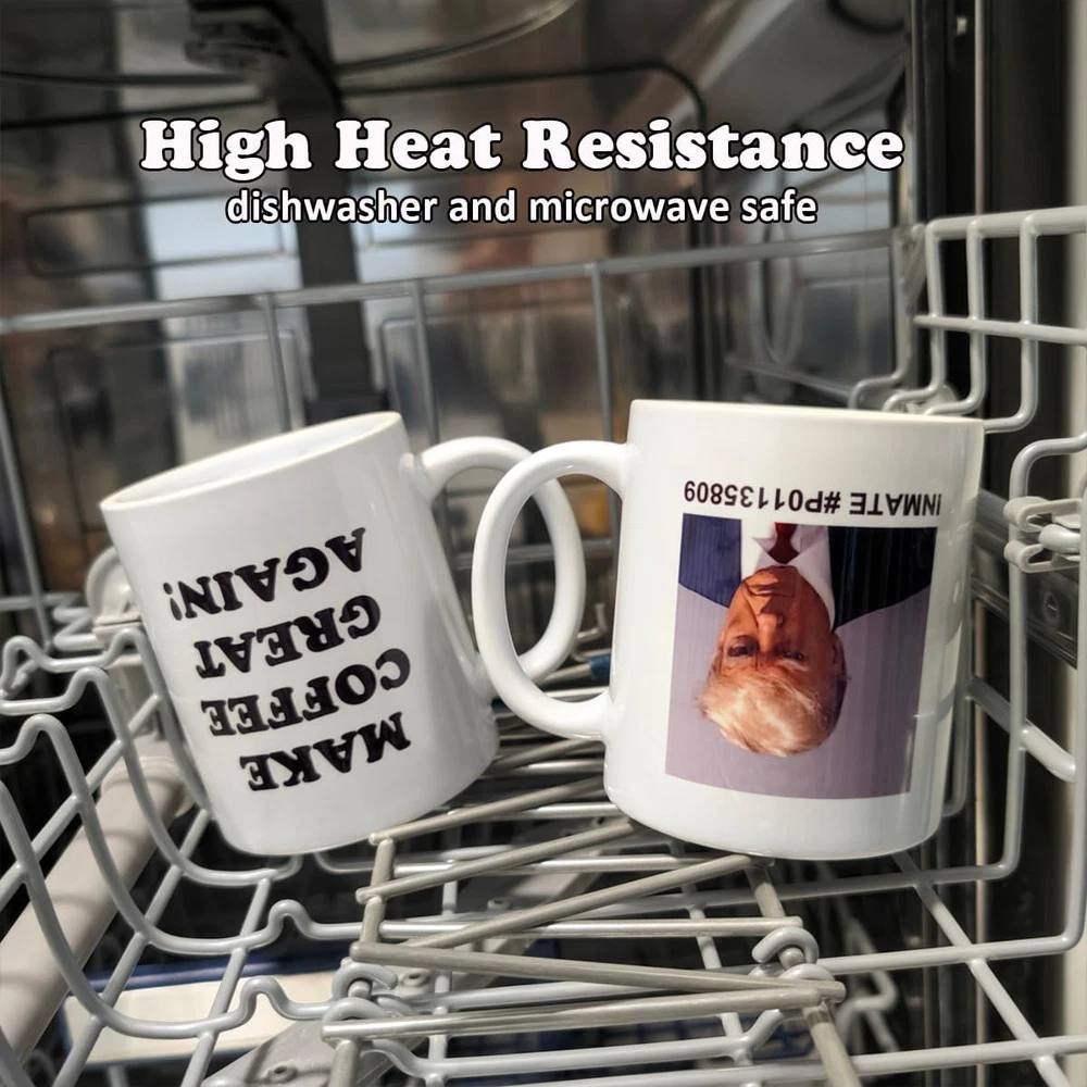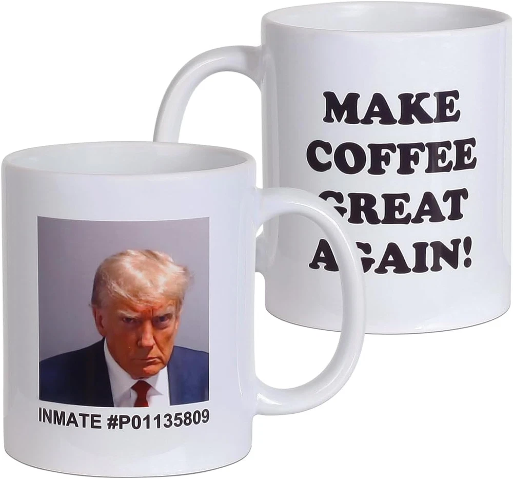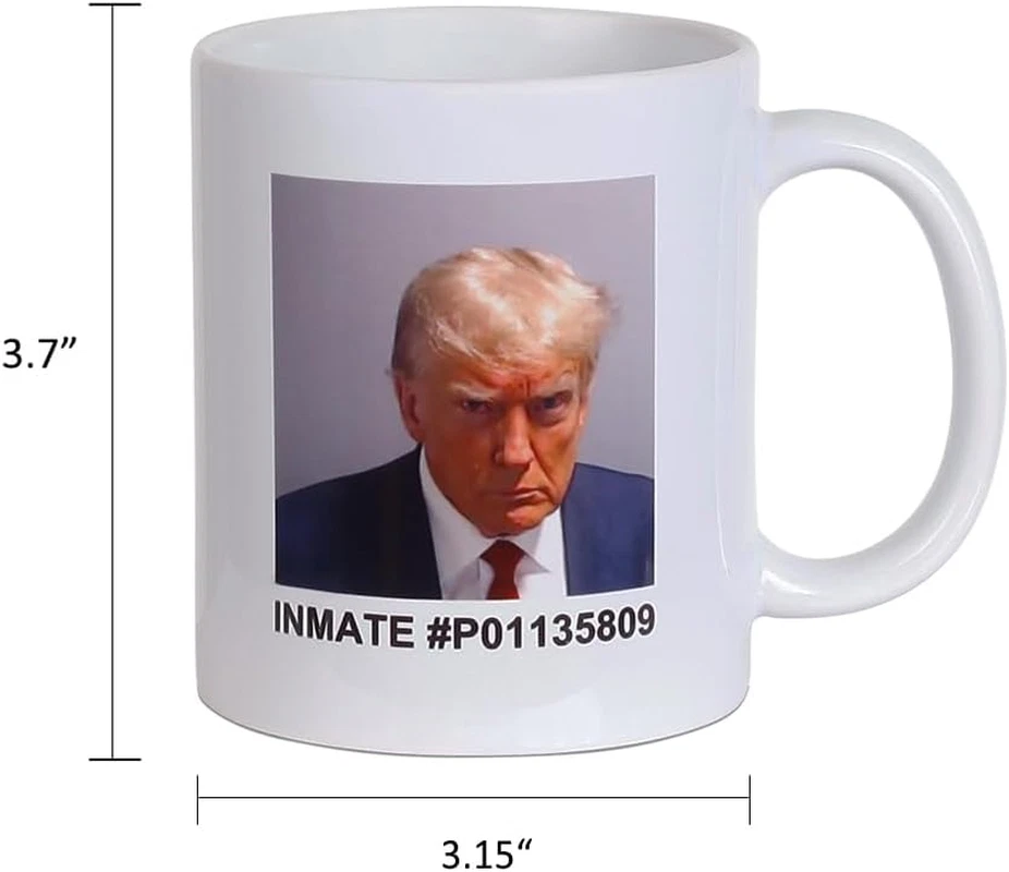Trump Funny Coffee Mug: Front view – trump mugshot mug with centered Donald Trump mug shot and inmate number; back view - white mug with centered “MAKE COFFEE GREAT AGAIN”. A great gag gifts idea. Dishwasher safe and microwave safe, made of white ceramic with high heat resistance. Glazed with a glossy finish which looks great in any setting, the comfortable C-shaped handle ensures an easy and secure grip. Great Gag Gifts Idea: The Trump mug is a great trump merchandise for mom, dad, husband and wife. Standard 11 Ounce Coffee Mug: 3.15 inches diameter, 3.7 inches high. Looking for a gag gifts for your friends? Get your Trump coffee mug! The front view of this coffee mug is taken from Donald Trump’s mugshot in the Fulton County jail, back view is centered “MAKE COFFEE GREAT AGAIN” logo. The Trump mugshot mug made of high quality white ceramic which is dishwasher safe and microwave safe. A funny coffee mug gift for men women. Capacity: 11 oz Height: 3.7 inches Diameter: 3.15 inches