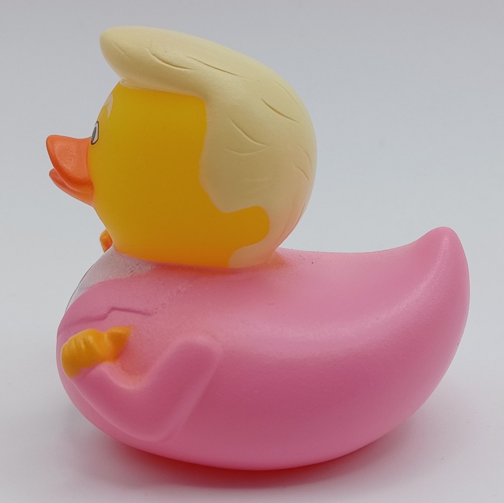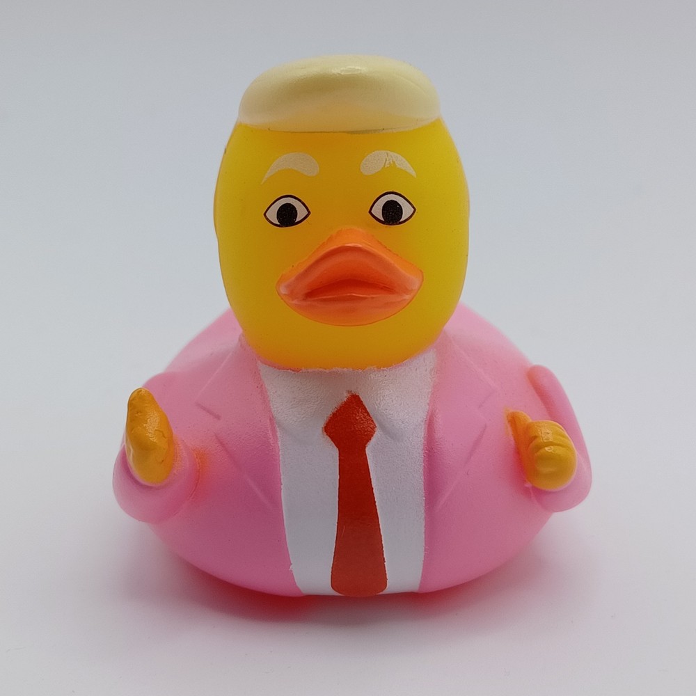 Trump rubber ducky stands 1.8 inches tall with thumbs up.