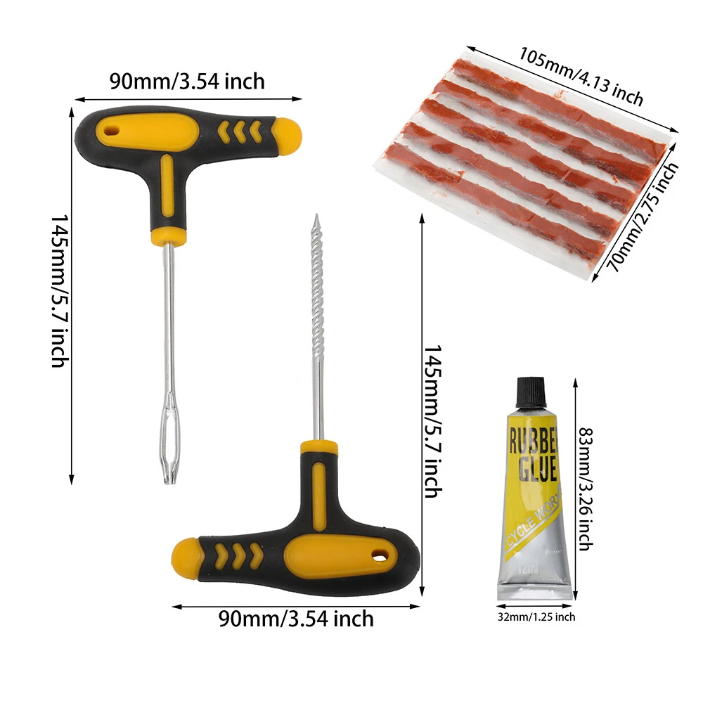 Car Tubeless Tyre Tire Puncture Repair Plug Repair Kit Needle Patch Fix Tool Set Details Car Tire Repair Tools Kit with Rubber Strips Tubeless Tyre Puncture Studding Plug Set for Truck Motorcycle Features: 1.Emergency Vehicles Puncture Repair Kit for Tubeless Tires. 2.The Car Tyre Repair kit will allow you to mend punctures quickly and effectively. 3.Durable Plastic Handles providing great grip. 4.Essential for Vehicles with Tubeless Tires. 5.This Rasper Tool allows Tire hole widening and cleaning. 6.Needle Tool allows Tyre Rubber Strip insertion. 7.Useful Tool to keep in the car with spare wheels. How to use: 1.Remove object that causedthe puncture. Insert the rasp tool into hole and slide up and down to roughenand clean the inside of the hole 2.Coat needle tool withrubber cement and slide up and down into hole to lubricate area. 3.Insert a repair plughalfway through slit of needle. 4.Gently push needle throughhole until about half inch is left of the plug. 5.Pull split eye tool leavingthe plug inserted into hole. 6.Trim excess plug stickingout and let dry. Inflate tire and test for leak Package Content: Emergency Tubeless Tyre Tire Puncture Repair Tool Kit includes: 1x Rasper Tool. 1x Needle Tool. 1x Rubber Solution. 5x repair Strips. On Jun 18, 2024 at 00:28:52 PDT, seller added the following information: On Aug 13, 2025 at 23:01:20 PDT, seller added the following information:
