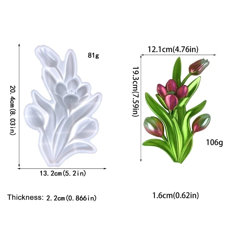 Features: Create Beautiful Tulip Flowers with Ease: This semi-3D tulip silicone mold allows you to create and realistic-tulip flowers effortlessly. High-Quality Silicone Material: Made of high-quality silicone, this mold is durable, flexible, non-stick, and easy to clean, making it perfect for all your crafting needs. Ideal-for DIY-Crafters: Whether you're a beginner or experienced-crafter, this mold is perfect for creating beautiful-tulips for your DIY projects. Versatile Usage: This mold is perfect for creating a wide of including soap, resin, clay, and more. Unleash Your Creativity: With this tulip-mold, Let your imagination run wild and create unique and beautiful that will impress everyone. Specifications: Material:Silicone Size:Approx.20.4x13.2x2.2cm/8.03x5.2x0.8" Color: Clear/Blue Package Includes: Piece Silicone Mold note: Please allow 1-2cm errors due to manual measurement,Please make sure that you do not mind before you order. Due to the difference between different monitors, the picture may not reflect the actual color of the item.