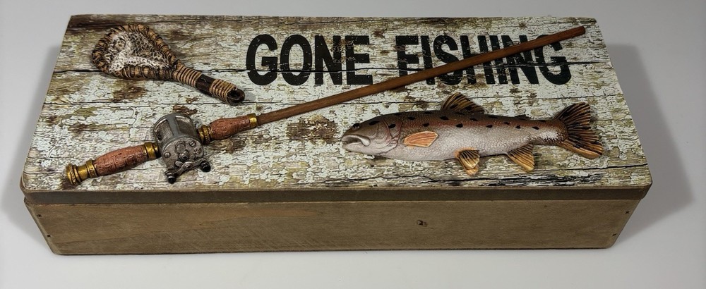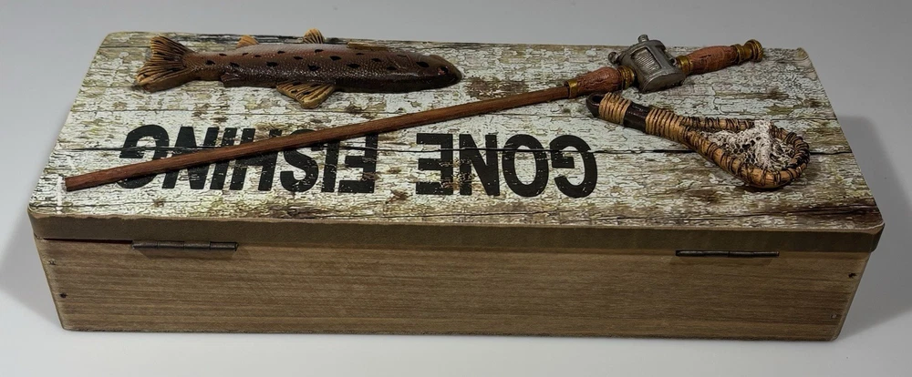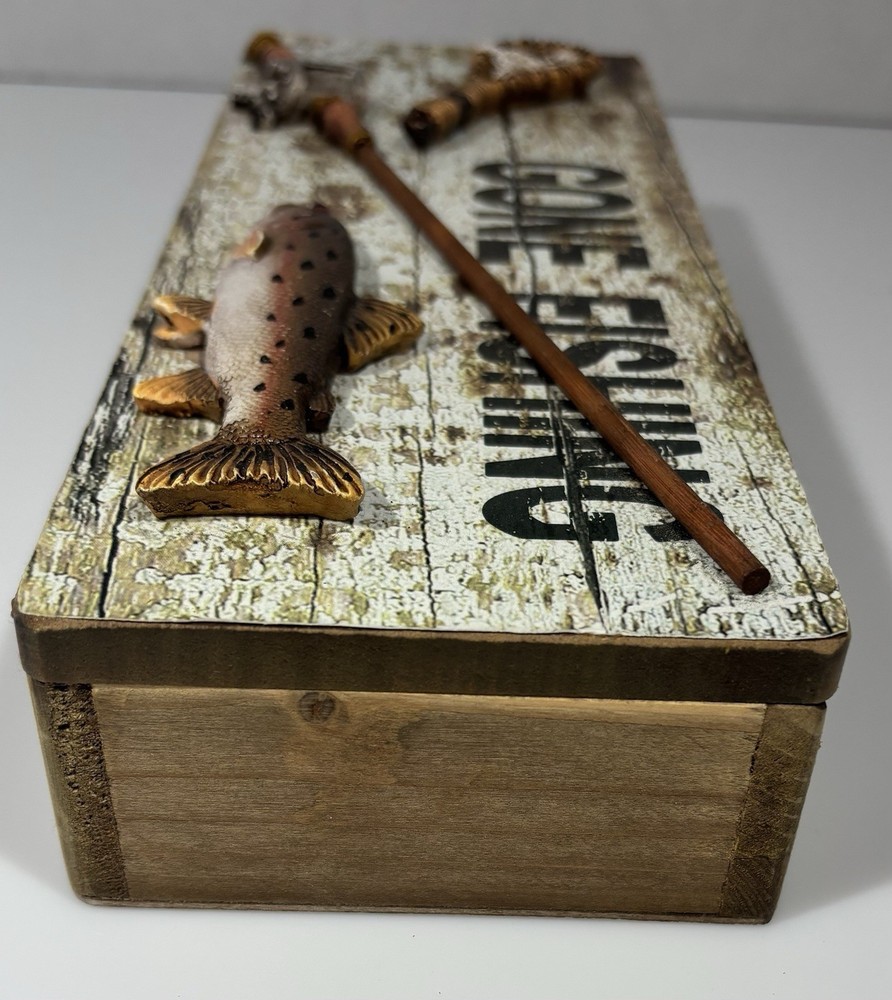 The Tumbler Gone Fishing Real Wood Box is a small, rustic trinket box perfect for storing fishing-themed keepsakes. Made of wood, this multicolor box features a fishing-themed design, ideal for any outdoor enthusiast. The real wood construction adds a unique touch to this decorative collectible, making it a great addition to any fishing collection.