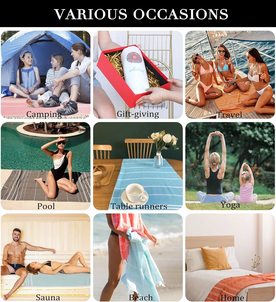 Free eBay listing template designed by dewiso.com Turkish Beach Towels Outdoor Picnic Throw Blanket Camping Towel Quick Dry Lightweight No Sand Extra Large Accessories Gear Essentials Glamping Tent Gear Must Haves Hiking Supplies Backpacking Gadgets FREE AND FAST SHIPPING! About this item QUICK-DRYING & FADE-RESISTANT: Machine washable for easy care, this towel dries quickly, absorbing moisture to keep you dry and comfortable. Its fade-resistant fabric ensures that the vibrant colors stay bright, wash after wash. Enjoy a towel that keeps you fresh and ready for every beach day. SAND-FREE & LONG-LASTING: Designed with a sand-repellent fabric, this towel prevents sand from sticking, allowing you to relax without the mess. Its durable construction makes it ideal for rough surfaces like the beach, with edges sturdy enough to withstand friction and repeated wash. GENEROUS SIZE & PORTABLE: With plenty of room for lounging and relaxing, this towel offers the perfect balance of comfort and space. Despite its generous size, it’s lightweight and folds up effortlessly, making it easy to carry wherever you go. Enjoy maximum comfort without the hassle of bulky towels. VERSATILE & THOUGHTFUL GIFT: Ideal for the beach, poolside, yoga sessions, or outdoor picnics, this towel is your all-in-one companion. Its chic design and superior quality make it a standout gift for any celebration, blending usefulness with style to leave a lasting impression on your loved ones. COMMITTED SUPPORT TEAM: We prioritize your satisfaction. If you have any questions or concerns, our responsive customer support team is ready to assist you. We’re committed to providing the best experience, ensuring you feel confident and happy with every purchase. Product We offer a 30-Day Return Policy on items which you are not completely satisfied with. You have the option for a full-refund or an exchange of the item. No returns are available on items shipped outside of the US . Shipping We offer Free Shipping to the US and ship within 2 business days of payment, usually sooner. We use UPS express shipping. That's why your products are usually delivered within 3 days . Contact We try our very best to make sure every customer is completely satisfied. If there's a problem , message us! We're happy to help. 24/7 live chat available.