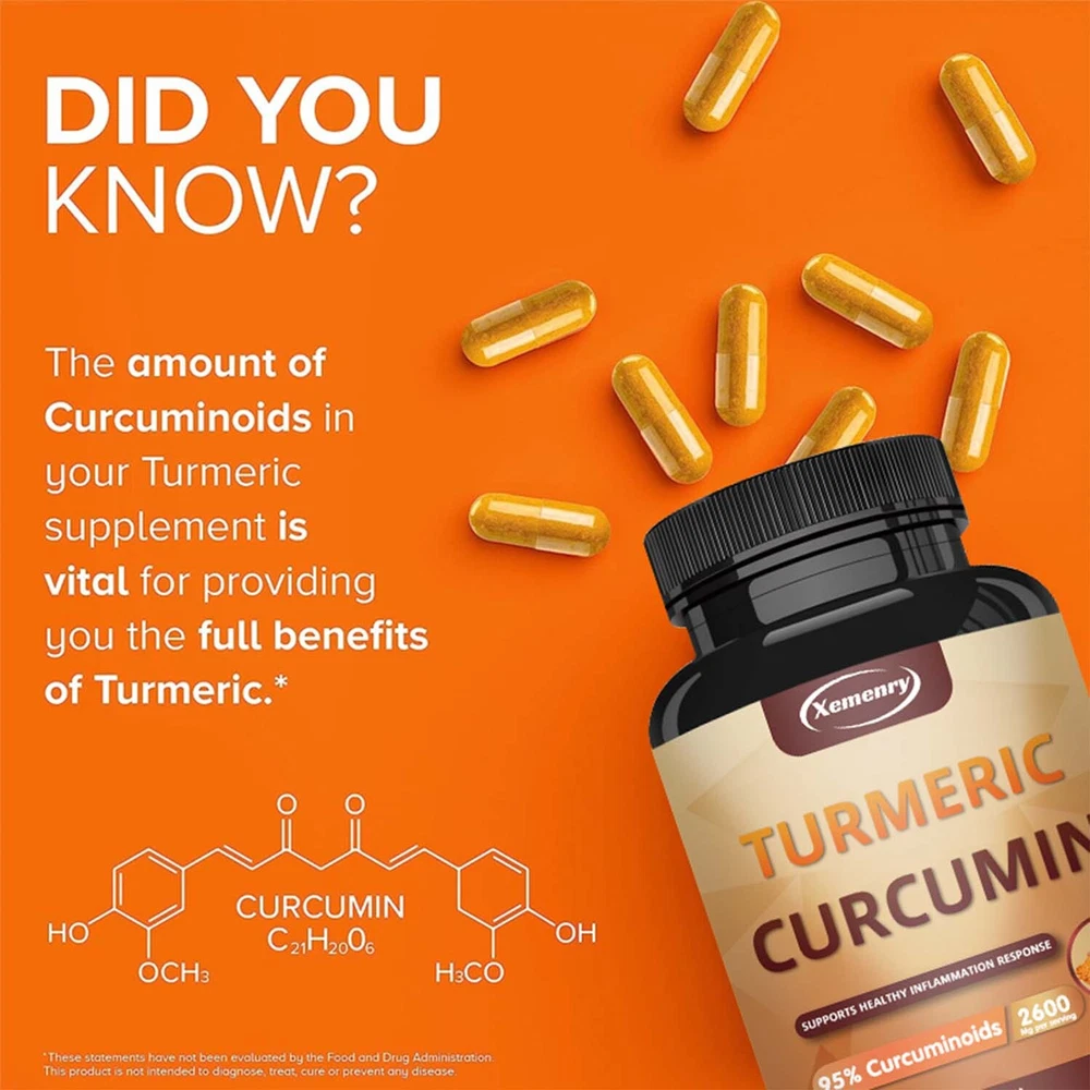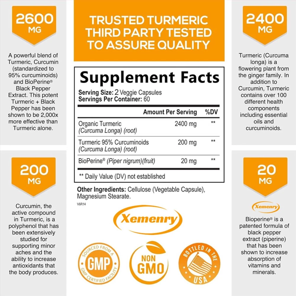Effects: Antioxidant, Heart and Joint Health Ingredients: Turmeric, Curcumin Directions: Take 2 capsules once daily after a meal. Shipping: Ships within 48 hours on working days. Shelf life: 2 years Description: Powerful Turmeric Curcumin: Our premium Turmeric Curcumin Complex 2600 mg; Contains 95% standardized curcumin; Added piperine (black pepper) for maximum potency, absorption, and bioavailability. JOINT SUPPORT: Our curcumin provides a healthy inflammatory response in an overworked body and helps promote joint comfort. POWERFUL ANTIOXIDANT: Curcumin, one of the primary compounds in turmeric, has antioxidant properties that support heart and joint health, helps prevent oxidative stress and deterioration, and supports brain function and the immune system. TRUSTED: formulated and manufactured under strict GMP guidelines and are third-party tested to ensure the quality and purity of each batch. Document