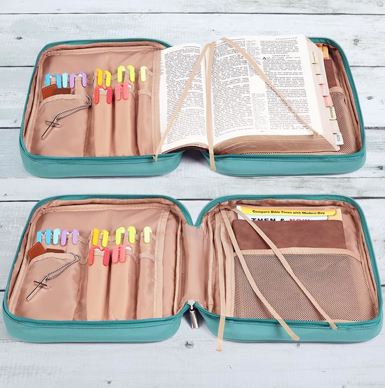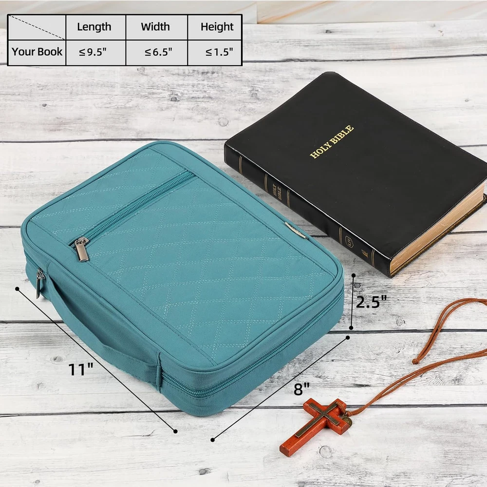 Absolutely love this Bible cover! The turquoise color is vibrant, and the durable material keeps my Bible protected. The zippered pocket is perfect for storing pens and notes, while the handle makes it easy to carry. Fast shipping and excellent customer service—highly recommend!