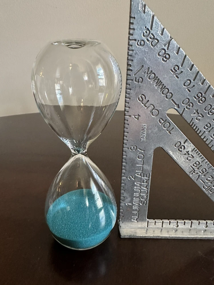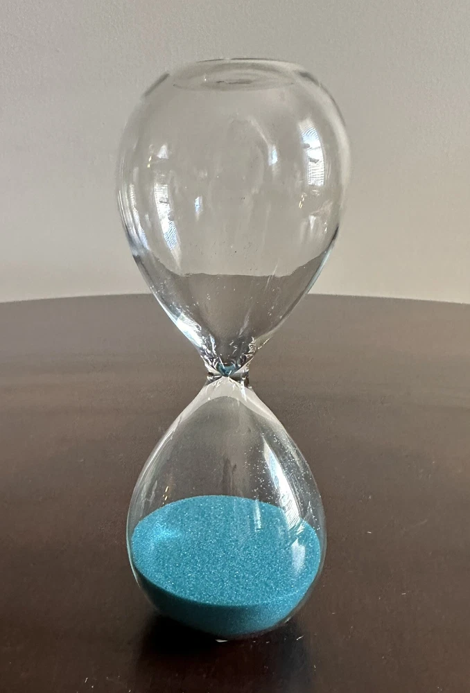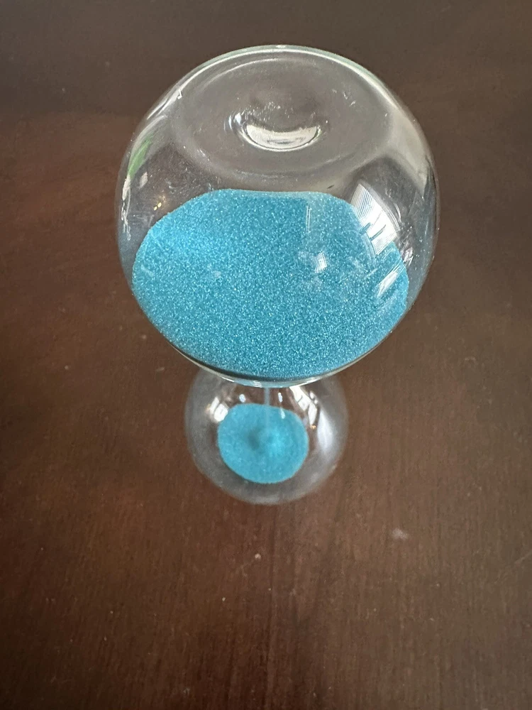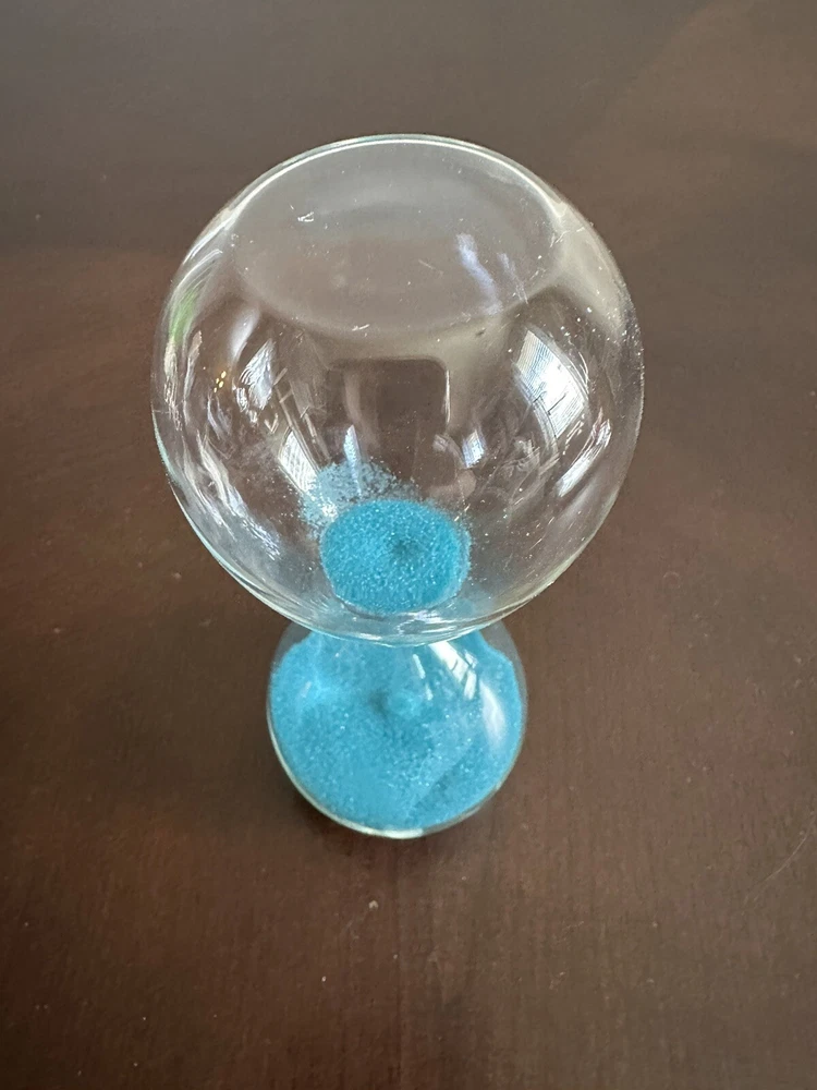 Add a touch of elegance to your home decor with this unique 10 minute hourglass/sand timer. The beautiful turquoise color of the sand and clear glass make it a stunning addition to any kitchen or living area. Measuring 6 inches in height and 2.25 inches in depth, this timer is perfect for keeping track of time without sacrificing style. Ideal for those who enjoy unique and beautiful home decor. Its 10-minute hourglass design allows you to keep track of time with ease, while the glass material adds a touch of sophistication.
